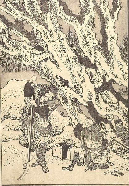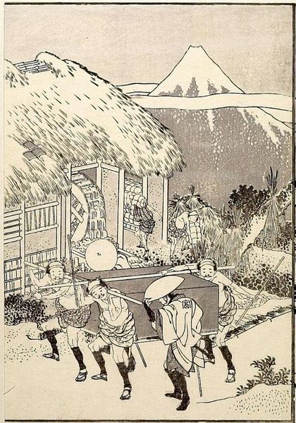 Curator: This is Hokusai's "Fuji under a Sluice," part of his "One Hundred Views of Mount Fuji." It's fascinating how he positions the iconic mountain within everyday labor. Editor: Yes, it's much more than a landscape, isn't it? All these people working really grounds it. What strikes you most about it? Curator: I see a commentary on the relationship between the human and natural worlds, and how we extract resources. Consider the sluice—is it a symbol of progress or exploitation? The figures seem burdened, part of a system. Editor: That's a powerful reading. I hadn't considered the exploitation aspect so directly. Curator: Think about whose labor is absent, too. Who built the sluice? What social strata are we not seeing represented here? Editor: That's a great point. It makes me reconsider the whole scene in terms of power dynamics. Thank you. Curator: Understanding art is an evolving process. I'm glad I could share a new perspective on this work.
