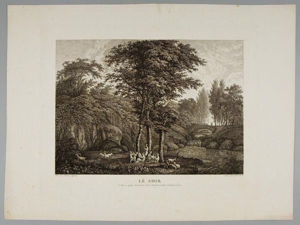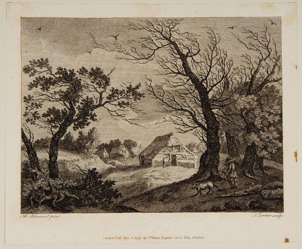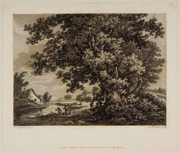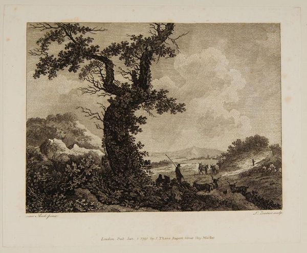 Editor: This is "Woman and Boy on the Road" by J. L. L. C. Zentner. I'm immediately drawn to the contrast between the intricate detail of the tree and the relatively simple rendering of the figures. What strikes you most about the composition? Curator: The meticulous etching technique creates a textural richness, doesn't it? Observe how the artist uses line weight and density to construct depth. Note how the interlocking branches of the tree create a complex structural pattern against the open sky. Editor: So, you're focusing on the lines and shapes themselves, and less on what the image represents? Curator: Precisely. The subject matter is secondary to the formal relationships at play. Consider how the artist’s structural choices impact the viewer's experience. Editor: That's a new way of looking at it for me, focusing on the composition first. Curator: Considering the art elements first is key to unlocking deeper understanding.