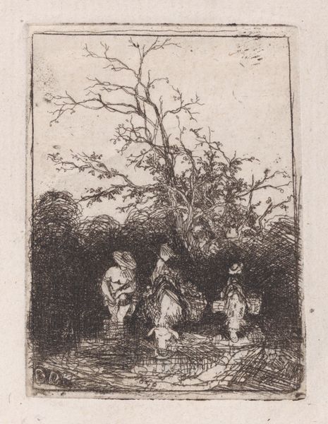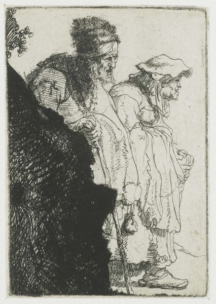 Curator: Rembrandt van Rijn created this etching, "Beggar man and woman behind a bank," around 1630. Editor: It’s…grim. Stark. Those lines really dig into the destitution of the figures. Curator: Rembrandt was indeed interested in depicting everyday life, especially those on the margins of society. Prints like this served a vital purpose, circulating images and ideas widely at the time. Think of it as a 17th-century social commentary, reaching a broader audience than paintings could. Editor: The roughness of the etched lines, the sheer amount of ink used to depict the gnarled tree…it mirrors the harsh reality of their lives. The man's fur hat seems worn, his face weary; even the woman’s posture is slumped with hardship. I see this and think of the laborious process of printmaking—the grinding of pigments, preparing the plate, each pull from the press. Curator: Absolutely, and it’s crucial to remember that the creation of these images and their reception were influenced by specific cultural and political contexts. Images of beggars could evoke complex emotions, from pity to fear, reflecting social anxieties about poverty and order in Dutch society. Editor: Look at the way he uses line. So much crosshatching creates shadows and texture that just reinforce a sense of weight, the literal and figurative burden they carry. And the choice of etching—that bitten line feels more visceral than a smooth engraving ever could. The making really underscores the subject matter here. Curator: Rembrandt returned to these themes throughout his career. This piece tells us a lot about his interests in social issues and the visual language he developed to represent them. It reminds us that art doesn’t exist in a vacuum; it’s intertwined with the society that produces and consumes it. Editor: Agreed. Examining the material and process illuminates how Rembrandt wasn't just recording an image, he was crafting a statement through labor, ink, and the printing press, a statement about those often unseen in Dutch society. This close focus shows the skill and effort to tell a meaningful, though stark, story.