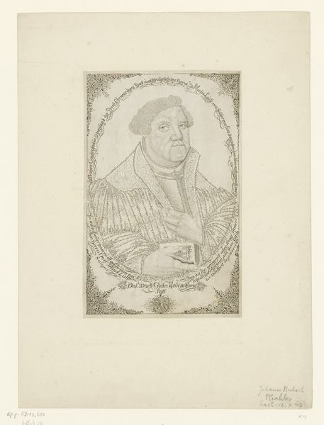 This is an engraving of Frederick the Wise of Saxony, made by Lucas Cranach the Elder. It’s a small work, yet the textures and the intricacies of line create a compelling presence. Notice how Cranach uses the etched line to build volume and depth. The density of the marks describes the fur collar, and the lines articulate the folds of fabric, creating a rich surface. The even light emphasizes the details and textures across the plane, flattening the image. This technique serves to abstract the subject. The figure is presented in a semi-circular frame, flanked by heraldic shields, which gives an abstract, timeless quality to the portrait. The plate mark is clearly visible, reminding us of the printing process. By emphasizing the material qualities of the print, Cranach draws attention to the act of representation itself. The symbolic weight of the image shifts from the figure to the system of signs and the means of production.