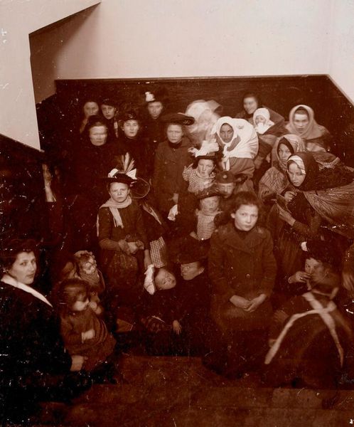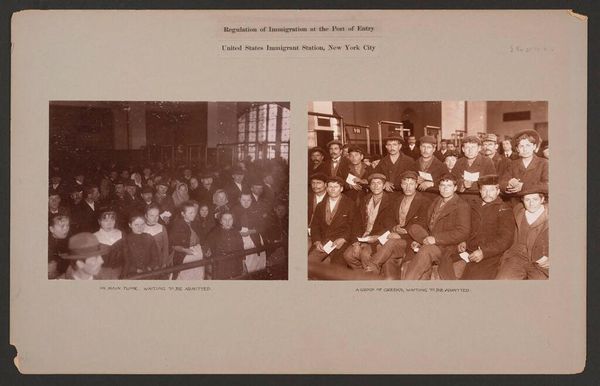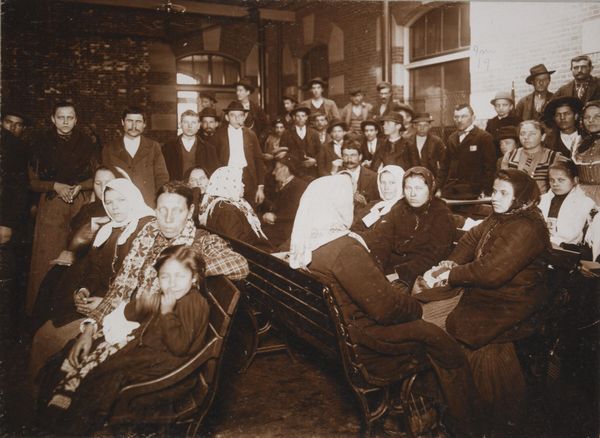 Editor: This photograph by J.H. Adams, titled "Races, Immigration," shows a crowd awaiting admission. The sepia tones create a sense of historical distance. What compositional elements stand out to you? Curator: The photograph’s formal structure is quite compelling. Note the stark contrast between the foreground and the background. The geometric rigidity of the architectural elements, juxtaposed with the organic mass of people, creates a visual tension. Editor: I see that. The strong verticals and horizontals do frame the figures. What does that tension suggest? Curator: It begs the question: how does the geometric order imposed by the architecture interact with the humanity contained within it? What is being contained? Editor: It makes me think about control and freedom. I hadn't considered the architecture as a character in the scene. Curator: Indeed. The artist’s careful arrangement of light and shadow further accentuates this interplay. Light here functions as a metaphor of hope. Editor: I’ll definitely look at photographs differently now.