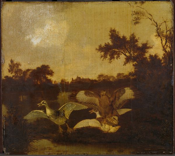 This canvas presents an anonymous creation depicting a hawk's violent attack on ducks. The hawk, poised mid-strike, embodies potent symbolism rooted in the ages. Consider the motif of the predator and prey, recurrent in art across cultures. The hawk, with its piercing gaze and deadly talons, often symbolizes power, dominion, and aggression. Yet, these symbols are not static. The image of the hawk as a predator is found in ancient Egyptian art, where it symbolizes divine power and protection, and it’s later reinterpreted in heraldry to signal military prowess. In contrast, the ducks represent vulnerability and innocence. This scene evokes primordial emotions – fear, survival, and the raw, unbridled forces of nature. It's a visual echo of humanity's own struggles and fears, engaging us on a subconscious level. This representation of the eternal chase is perpetually evolving, reminding us that cultural memory shapes our perceptions and imbues familiar symbols with ever-shifting meanings.