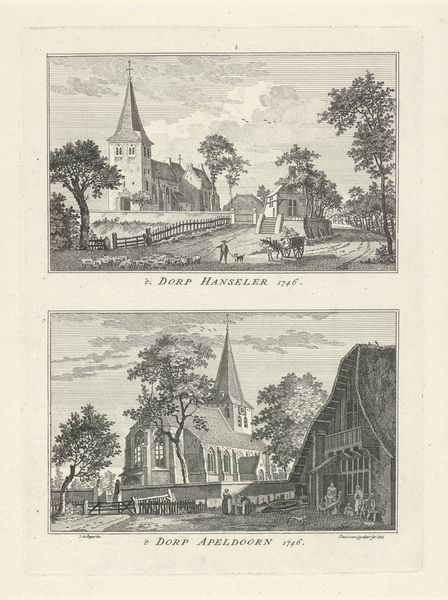 Curator: Well, hello there. This engraving by Paulus van Liender, titled "Dorpsgezichten te Hassum en Hommersum, 1746," but actually made around 1760, gives us two quaint Dutch village scenes in one composition. What catches your eye first? Editor: It's… charmingly mundane, I suppose. The detail in the buildings is appealing but also gives it the vibe of a carefully cataloged inventory. There’s something quite neutral in the feel, despite the clear skill involved. Curator: Yes, the meticulous details do invite closer examination. Van Liender’s work is fascinating in how it elevates the everyday. We must remember that this print circulated within specific networks of patronage and print shops. The rise of the print market and the networks between artists and publishers allowed for new methods of distributing information, especially visual information about places near and far. Editor: That’s right, it wasn't just artistic expression. Prints were commodities produced by labor. Engravings required training, specific tools, and the involvement of printers. We must think about this circulation as a cultural process as much as an aesthetic experience. So who consumed these images and for what purpose? Curator: Likely affluent landowners, or members of the rising middle class. These images served to document their property holdings and maybe even project an idealized vision of their domain and way of life. There’s a strong sense of order, but a sanitized one too, if you look closely. Where is the dirt, noise, and physical work involved in making this community run? Editor: It also reminds me that printmaking offered a different class of artists new opportunity: It democratized art in some ways, and yet its own techniques reproduced hierarchical access to visual culture. The ability to copy and reproduce something becomes important in how we consume information in public. Curator: Absolutely. And while these images portray rural life, we cannot see it separate from the booming urban centers that consumed prints en masse. The rise of Amsterdam and other major cities gave way to print workshops that made work for all different audiences. The art itself became something of an artifact. Editor: Exactly. Thinking about the networks between artists, printers, merchants and the broader social context reframes our interpretation. What seemed at first merely quaint landscape becomes loaded with socio-economic weight. Thanks for guiding us through this work and considering it within these crucial systems. Curator: Of course, analyzing the history and the processes really underscores the artist’s choices and the ultimate influence this work had on society during the Dutch Golden Age.