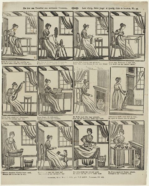 Editor: Here we have "Zie hier een Twaalftal van werkzame Vrouwen, Leer vlytig, Jonge Jeigd! al spoedig Huis te houwen," an engraving by Erve H. Rynders, created sometime between 1830 and 1855. It depicts twelve scenes of women engaged in various domestic tasks. It almost feels like a sampler. What's striking is the organization – almost like a comic strip about idealized womanhood. How do you interpret this work within its historical context? Curator: That’s an excellent observation! Seeing it as a kind of early comic strip highlights the burgeoning print culture and its role in shaping social expectations. Consider how these images would circulate; these weren’t destined for museum walls. They were affordable, mass-produced, likely pasted into books or displayed in homes. The title itself underscores its didactic purpose: teaching young women the skills needed for "housekeeping," almost literally spelling it out to them. The "Dutch Golden Age" style, though past its peak by the 19th century, carried an ideological weight, evoking a sense of national pride and moral virtue connected with home life. How might the rise of industrialization factor into its message? Editor: That’s interesting! It makes me wonder if it's pushing back against industrialization by idealizing the domestic sphere. Were women feeling pressure to maintain traditional roles despite societal shifts? Curator: Precisely. As work began to move outside the home, prints like this served to reinforce and romanticize the domestic role of women. They weren't just teaching skills, they were upholding a specific social order. The image becomes a political statement, defining womanhood in relation to household labor and familial duty. Do you notice any differences in status represented between the scenes? Editor: Hmmm… I didn't notice it initially, but in some panels they seem wealthy and some seem poorer based on clothing and interiors? Curator: Exactly. The print both reinforces gender norms but subtly hints at class differences too. It highlights how expectations of women aren’t monolithic. Editor: It is so useful to learn how even seemingly straightforward images are entangled with culture. Curator: Indeed. And in the realm of art, these narratives constantly reveal insights.