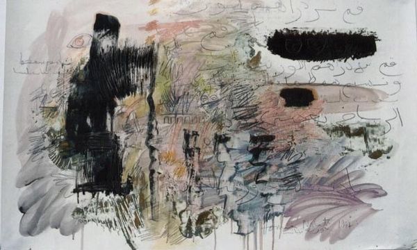 Editor: So, this is an untitled mixed-media painting by Houria Niati, created in 1995. I am really struck by the layering and almost frantic energy of it all. It feels chaotic but also quite controlled. What do you see in this piece? Curator: I'm immediately drawn to the symbols embedded within the apparent chaos. Do you notice the subtle presence of eyes, almost hidden in the composition? Think about how the artist uses them. Are they watching us, or are they a representation of inner vision? And what of the seemingly calligraphic elements woven throughout? Editor: Yes, I see the eyes now that you point them out! And I assumed the calligraphic elements were just abstract marks. Are they actually words? Curator: Perhaps not literal words, but consider the *idea* of language. Niati may be invoking cultural memory, specifically North African identity. These symbols could act as echoes of lost or suppressed narratives, or the disruption and (re) invention of traditional cultural forms through colonial encounters and cross-cultural dialogue. How does the contrast between the rigid, geometric shapes and the fluid ink strokes contribute to that feeling? Editor: That tension between order and chaos definitely reinforces the feeling of disrupted communication. And the grid-like structures... I initially saw them as abstract, but in the context of everything else you're saying, maybe they are like fractured windows? Curator: Precisely! They might symbolize confinement, observation, or even a fragmented view of the world. Does knowing that the artist is of Algerian descent change how you interpret those symbols? Editor: It does! It makes me think more about themes of displacement and cultural identity, like you said. I wouldn't have picked up on all that without you pointing out the symbolism. Curator: And I find your reading of 'fractured windows' a beautiful and potent reading of the symbols of order being disrupted by the flow of cultural expression. I, for one, will think of them in a completely different way next time! Thank you.