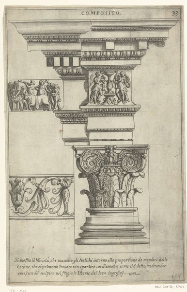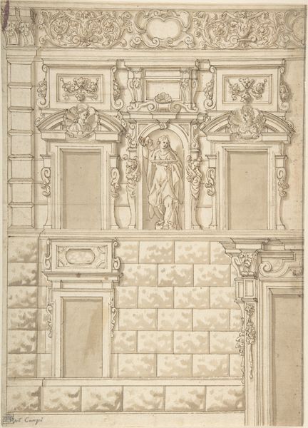 Curator: Take a look at this drawing, titled "Wall with Hunting Designs." While undated, we attribute it to Grinling Gibbons. It's executed in ink, pencil, and graphite on paper. Editor: Huh. It reminds me of an abandoned movie set. All this ornate…scaffolding? Makes you wonder what kind of grand drama was meant to unfold. Curator: Indeed. This is likely a design for interior paneling, common in aristocratic houses during the late Renaissance. Gibbons was famous for intricate carving. This drawing probably precedes that physical labor. Editor: So, blueprints for the ridiculously wealthy? I like that we see the hunting motif echoed in little cameos at the top—reminds you who this is really *for.* And the single standing figure, he looks almost like an actor on stage. Curator: That single figure, set in its own framed recess, highlights the status and power associated with hunting, a sport traditionally restricted to the elite. Editor: You can just imagine the kind of lord who would want that above his fireplace! Curator: It's also about celebrating dominion over nature and the embodiment of strength and skill. Drawings such as this provided patrons with detailed visions before committing to lavish, time-consuming projects. Editor: Must have been an intimidating process, committing to such a vision… But if you were already Lord of the Manor, then it all must have been water off a duck's back. Curator: These sketches represent the intersection of art, design, and social standing, capturing not only an aesthetic, but also the values of the privileged during that era. Editor: Now that you've put the setting to it I appreciate it so much more. Almost feels like I was on location, but with the knowledge to tell that it's only the blueprint and all. The imagination still comes into it, in a strange and amazing way!