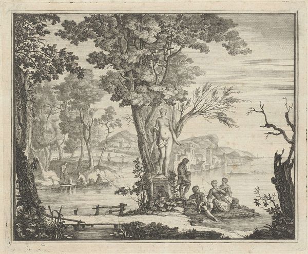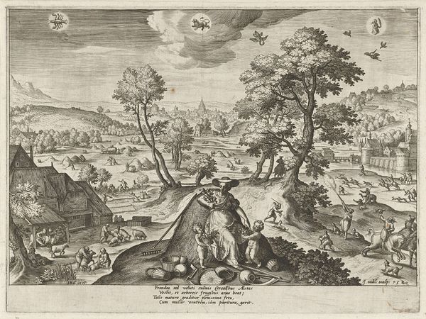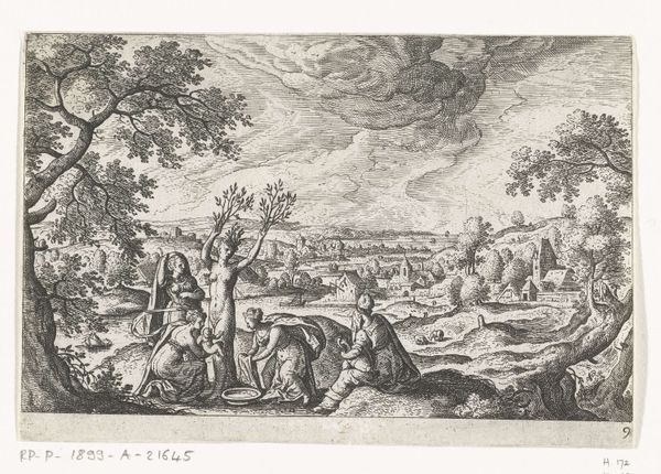 Curator: Here we have "Liefdesscène met Jupiter," or "Love Scene with Jupiter," an anonymous print dating roughly from 1550 to 1650, held at the Rijksmuseum. What catches your eye? Editor: Immediately, the overall silvery tonality created by the intricate engraving work; it's quite delicate. A restful, if slightly melancholic, pastoral scene seems to unfold. Curator: The landscape is interesting, almost Flemish in its details, with a distant town rendered in miniature. Above, Jupiter rides in his chariot among the clouds. His presence introduces themes of mythology, of course. This image clearly resonates with certain symbolic traditions. Editor: I’m struck by the formal arrangement. The dominant tree acts almost as a central pillar, bisecting the landscape and creating distinct foreground and background planes. Look at how the light falls--unevenly--creating textural variety. Curator: Note how Jupiter’s positioning also balances the weight of the tree on the right; there is an intentionality here. The reclining lovers under the tree probably represent one of Jupiter's many amorous encounters; given his chariot, perhaps he's arriving to meet with her? It evokes both earthly pleasure and divine intervention. Such prints, popular at the time, offer visual cues about power dynamics, desire, and social hierarchies, often intertwined with classical narratives. Editor: Agreed. And the circular form down front on the grass, a platter maybe, seems poised to visually echo and offset Jupiter’s celestial trajectory; note the directional force, too. Jupiter rushes in as love happens lazily down here on the ground. It’s a study in compositional contrasts. Curator: This piece exemplifies the allegorical narratives popular in art. We’re drawn into this image not just by its visual elements but by the underlying cultural code that celebrates knowledge, sensuality, and idealized landscapes. It reminds us that these are complex windows onto a worldview different from our own. Editor: It’s certainly impressive how such intricate lines in monochrome achieve a sense of depth and subtle light variations to draw out deeper ideas and concepts. Seeing art as structural, almost mathematical, adds to my understanding of the artwork and its purpose. Curator: Indeed, whether we read it through symbols or dissect its composition, this work serves as a powerful statement about cultural memory. Editor: It is incredible to consider how a seemingly simple print allows so many visual interpretations.