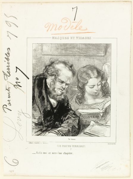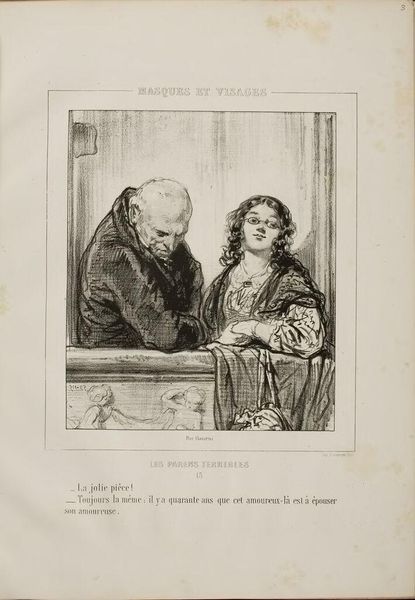 Editor: Here we have Paul Gavarni’s lithograph from 1853, titled “Les-Parents-Terribles series: A lovely play, always the same.” It’s currently housed at the Art Institute of Chicago. The two figures seem confined, almost trapped, by the architecture around them. How would you interpret this piece? Curator: Considering Gavarni’s context, we must consider lithography itself: its rise provided a new mode of affordable image production and mass consumption. The material process is crucial; consider how easily Gavarni’s images could circulate, becoming commodities consumed by a broad public. Editor: That’s fascinating! So, you’re suggesting that the medium itself influenced how the subject matter was received? Curator: Precisely. Gavarni's focus on genre painting reflects the growing interest in everyday life and social observation. But also, let's not forget the social critique inherent in the title "Terrible Parents." Think about the labor involved in producing such a print and how it reaches an audience engaging in its own form of work. Editor: It’s interesting to view their troubled relationship through the lens of print production and its accessibility. It moves beyond just seeing a snapshot of their domestic life. Curator: It pushes us to acknowledge the machinery behind artistic production. Who gets to see art, how is it made, and how much does it cost are crucial components to understanding this artwork, don't you think? Editor: Absolutely. Thinking about the lithograph's material context really reframes my perspective on the artwork, shifting it towards how it functions within a larger system of production and consumption. Thank you!