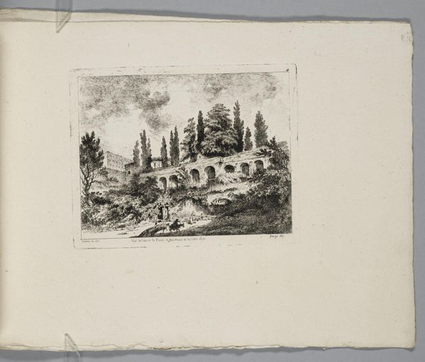 Editor: This is Jean-Claude Richard, Abbé de Saint-Non's "View of the Gardens of the Villa d'Este in Tivoli," a delicate print. The scene feels tranquil, almost melancholic. What stands out to you? Curator: The Villa d’Este gardens were designed to evoke paradise, a classical Golden Age. Notice how Saint-Non uses the cypresses, symbols of mourning and remembrance, juxtaposed with the idyllic garden. What does that tension suggest to you about the artist's view of paradise? Editor: Perhaps that even in paradise, there's an awareness of loss or the passage of time? I hadn't considered that before. Curator: Precisely. Symbols invite us to look beyond the surface and engage with deeper cultural memories.