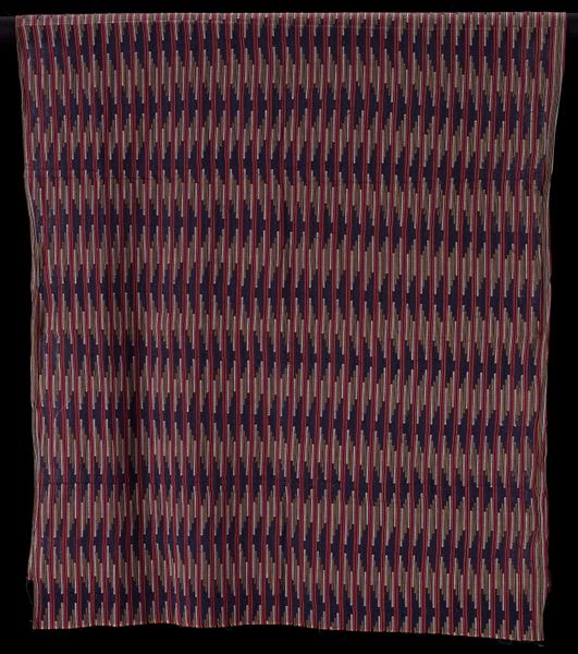 Editor: This is a Yoruba Skirt or Wrapper, made from cotton textile around the 20th century. I'm really struck by how the geometric pattern creates this sort of visual rhythm. What can you tell me about the piece? Curator: Let’s consider the intrinsic elements first. Note the careful repetition and variation within the geometric forms. There’s a strong interplay between the pink vertical rectangles and the underlying indigo field patterned with what appear to be stylized, repeating "E" motifs. Do you observe how these elements work together? Editor: Yes, the rectangles pop because of the contrast with the dark background, and the little 'E' shapes add another layer without making it too busy. It feels carefully balanced. Curator: Precisely. The vertical orientation of the pink shapes creates a clear visual pathway. Furthermore, observe the material—cotton textile. The inherent qualities of the woven cotton also contribute to our reading of its structural nature, yes? Editor: Definitely. The texture isn't perfectly smooth, which gives it a very tactile quality, I think. It reminds me that someone made this by hand. It feels grounded and organic to the touch. Curator: Yes, very good. Through its materiality and structured geometric design, the piece achieves a compelling visual effect. Editor: I never would have looked so deeply into the interplay of these shapes, or thought about the medium adding to it. Now I see it's a lot more intricate than I first assumed. Curator: The visual architecture reveals itself with sustained contemplation.