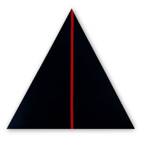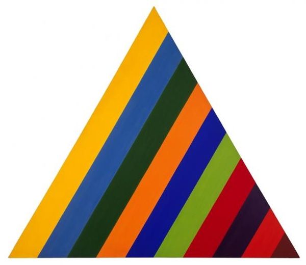 Editor: This is Jeremy Moon’s "Indian Journey," painted in 1964 using acrylic. The way the geometric forms intersect and how the lines converge feel like I’m looking into some sort of portal. What symbolic ideas can we find in a piece like this? Curator: What a perceptive observation! We have to look at color theory. Notice how Moon juxtaposes these colors – deep burgundy against those bands of vibrant hues. Consider burgundy: it suggests maturity, grounding… almost like the earth itself. Then we have these very crisp lines of red, blue, green… what feelings or memories might those brighter colors evoke? Editor: Excitement maybe, or a sense of the modern. Is that why this is sometimes called "Pop Art?" Curator: Indeed, but not just for the colours. Remember that triangles have held symbolic meaning across millennia in countless cultures; think pyramids, sacred geometry. Does this upward-pointing triangle strike you as stable? Does it seem to invite upward movement? How might that interplay with our understanding of a 'journey'? Editor: It’s less stable than a square, right? And maybe the lack of stability *is* the journey - you're always moving. The colors really pull the eye. I see what you mean. Curator: And the word ‘Indian’ in the title...do you feel Moon references any element of Indian artistic or spiritual tradition through the symbols, or is the journey itself a Western interpretation, a filter? Perhaps the colours, vibrant and unexpected together, trigger an outsider's impression? Editor: It's definitely made me think about how Western artists interpreted and borrowed from other cultures during that time, which is really fascinating and not always straightforward. It's like there are so many potential readings embedded. Curator: Yes, and unpacking that cultural layering makes the "journey" of this painting all the more engaging for the viewer.