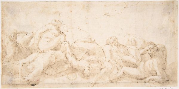 Francesco Allegrini’s "Cavalry Engagement," is a drawing rendered in pen and brown ink. The composition centers on rearing horses amidst a flurry of action, conveyed through dynamic, swirling lines. This technique evokes a sense of chaos and intense movement. The drawing uses line and form to construct a scene of battle, yet does so with an emphasis on energy rather than detail. The figures of the soldiers are merely suggested, their forms dissolving into the broader tumult. The arrangement of the composition might suggest the influence of Mannerist aesthetics, where drama and complexity are favored over clear narrative. The interplay between the defined and undefined serves to heighten the sense of conflict. Through the formal qualities of line and composition, this piece captures a moment of intense action while leaving room for the viewer's interpretation.