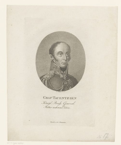 Curator: This portrait, rendered sometime after 1830, depicts Frederik Frans I, Grand Duke of Mecklenburg-Schwerin. The artwork is a print, utilizing engraving techniques. What are your initial thoughts? Editor: Stark. Even in monochrome, his gaze is striking, quite confrontational, really. There’s an attempt to portray power here, definitely calculated, but it doesn't quite reach the theatrical grandeur you sometimes see in these kinds of depictions. Curator: Yes, his stare holds authority, doesn’t it? And the engraver masterfully captured details – observe the epaulettes, medals, each conveying status and military might, recalling similar elements within neoclassicism. Editor: Absolutely, it's laden with those visual cues of authority. But it seems… staged somehow, doesn’t fully convince. It’s more about projecting an image than conveying genuine gravitas. What role would images like this have played at the time? Curator: These portraits served as powerful instruments, anchoring familial lineage, validating authority. They propagated a refined image, constructing public memory while establishing continuities across time. Symbols were instrumental, becoming an embodiment of the empire and its leader. Editor: A constructed narrative of legitimacy. This piece becomes more interesting when you consider how readily these images were reproduced. An engraving made the Grand Duke and his power far more accessible than a unique painted portrait ever could. Curator: Disseminating these images across the duchy allowed a wider section of the populace to familiarize themselves with their ruler’s iconography, effectively solidifying and stabilizing a nascent visual vocabulary for sovereignty. Editor: So it’s a carefully controlled act of image-building aimed at the wider populace through the means of printmaking? Curator: Precisely, it's power presented for public consumption and recognition through symbolic imagery. The continuity of this representation solidifying his position and perhaps justifying his line as rightful rulers. Editor: Well, examining it has reminded me how constructed "history" is—even in seemingly straightforward portraiture. Curator: Yes, art persists as cultural echo. These echoes can prompt reflections, deepening our understanding of the symbology and visual representations used through epochs.