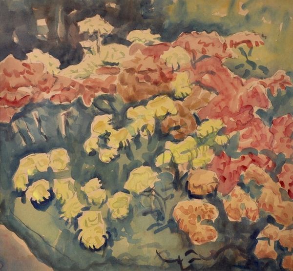 Editor: Rik Wouters' "Morning – Bosvoorde," created in 1913 using watercolor with an impasto effect, feels almost like a dreamscape. The colors are vibrant, yet the scene seems to dissolve into abstraction. What do you see in this piece, beyond the immediate impression? Curator: I see Wouters grappling with the rapid modernization of the early 20th century, filtering it through an intensely personal, almost utopian lens. Consider the context: Belgium was experiencing massive industrial growth, yet here's Wouters, turning away from urban anxieties, towards the countryside. The choice of watercolor itself speaks volumes. It's a medium often associated with the ephemeral, the fleeting moment, suggesting a deliberate attempt to capture a sense of disappearing natural beauty in the face of progress. Do you think the blurring of forms contributes to that feeling? Editor: Definitely. The lack of crisp lines makes the scene feel less solid, more like a memory. It's as though he's not just painting a landscape, but also a feeling. Curator: Exactly! And that feeling, that subjective experience, aligns him with the Expressionists, but also marks a turn inward. Think about the role of the "Morning" as a loaded symbol – fresh starts, potential, optimism. But what does it mean to situate that hope within a rapidly changing, and arguably destructive, socio-political landscape? Is Wouters critiquing the relentless march of progress by idealizing nature, or is he simply offering an escape? Editor: That's a powerful thought! Perhaps it’s both: a refuge and a subtle act of resistance, preserving the inherent value of nature when other views are beginning to disregard that view. Curator: Indeed! Wouters’ "Morning" then, isn't just a pretty landscape, but an intersectional commentary on modernity, nature, and the search for meaning in a changing world. Editor: I will definitely not look at landscapes the same way again after this insightful explanation!