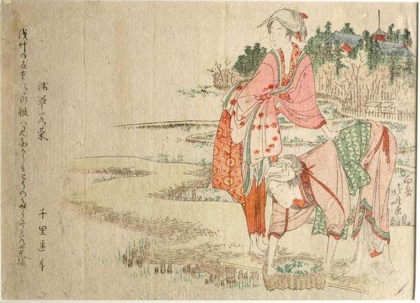 Editor: Here we have Hokusai's "Two Women and Small Child Catching Goldfish." It seems like a peaceful scene, yet there's something slightly unsettling about the women's focused activity. What do you see in this piece? Curator: The image is fascinating when we consider the Edo period's social structures. Hokusai often depicted everyday life, but even mundane activities, like catching goldfish, could reflect societal norms and class distinctions. What role do you think leisure played in public imagery at the time? Editor: I guess I hadn't considered the possible social commentary. It's interesting how a seemingly simple activity can carry so much cultural weight. Curator: Precisely! Hokusai's art often serves as a window into the socio-political landscape, prompting us to question the narratives embedded within these seemingly ordinary scenes. Editor: Thanks, I'll never look at goldfish the same way again! Curator: Likewise, this has been insightful!