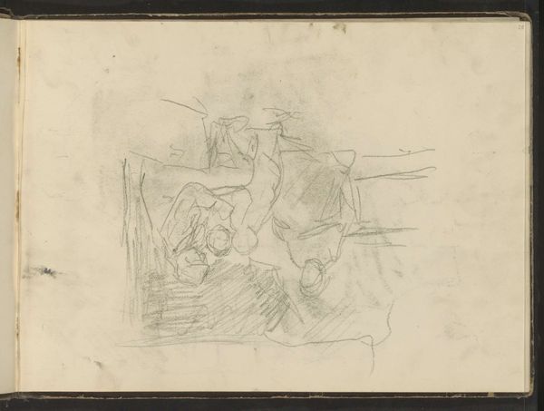 Curator: Today, we're looking at a piece entitled "Interieur met figuren bij een raam," which translates to "Interior with figures by a window." It's a pencil and watercolor drawing on paper. The artwork dates to sometime between 1854 and 1914 and is attributed to Albert Neuhuys. Editor: It feels ghostly. Ethereal. The wispy lines almost seem to dissolve before my eyes, as though the figures and forms within the drawing are fleeting memories. Curator: Observe how Neuhuys constructs the composition through a delicate network of lines. The structural integrity hinges on the precise balance between positive and negative space. Editor: I'm immediately drawn to the window, or rather, the suggestion of a window. It's a potent symbol of looking outward, of aspiration and connection to the world. In contrast to the obscured identities, the setting feels incredibly personal, the window giving hints to the outer and inner lives of the represented subject(s). Curator: You notice also that very light brown wash applied only on small parts of the image. Note the relationship between line and tone. Is it a wholly successful experiment in pictorial harmony? Editor: Perhaps not traditionally harmonious, no. But the near absence of shading evokes a specific mood. What does that withholding communicate? A sense of ambiguity and a turning away from specificity in favor of focusing on atmosphere. It's evocative of a particular style—Dutch Genre art—and it calls to mind the everyday rituals, domesticity, family life, or peasant scenes. Curator: Yes, there's an undeniable leaning toward impressionism in his broader portfolio, and within this work we witness his experimentation with perspective and form and the suggestion of detail that carries the burden of true precision. Editor: It strikes me that it reveals as much about the limitations of representation as it does about its possibilities. Or perhaps, it gestures towards how identity and circumstance get caught in a historical moment. I do not doubt that this artwork has much to communicate to its visitors today. Curator: It has been fascinating to consider it through different critical approaches. Editor: Indeed, the way the symbolism enhances our sense of time, memory and even cultural roots is striking.