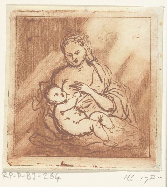 Francesco Vanni created this drawing titled "Mystic Marriage of Saint Catherine with Saint Jerome" using pen and brown ink with brown wash over black chalk on laid paper. The composition is dominated by the Virgin Mary, centrally placed and gazing downward, with Saint Catherine on the right and Saint Jerome below. The figures are softly rendered, with the pen and ink creating subtle tonal gradations and the brown wash adding depth. Vanni employs a grid of lines which underpins the composition, a technique used for scaling up drawings. The unfinished quality of the drawing invites us to consider the creative process. The overlaid grid challenges our perception by revealing the underlying structure. The varying degrees of finish across the figures suggests a visual hierarchy, a technique Vanni employs to guide the viewer's eye through the narrative, emphasizing the spiritual union. The structural underpinnings are integral, not only to the making, but also to the overall meaning of the artwork.