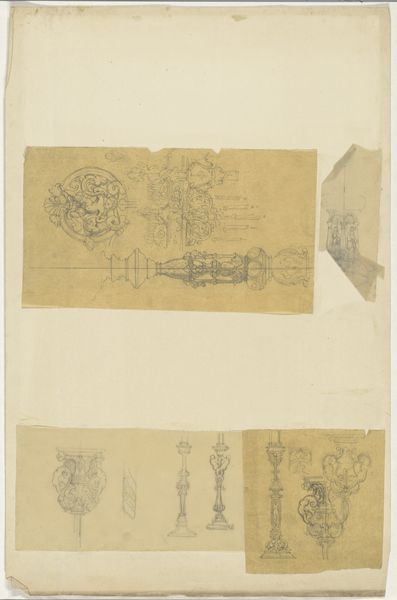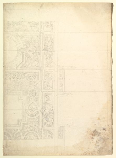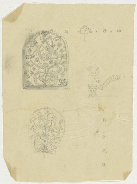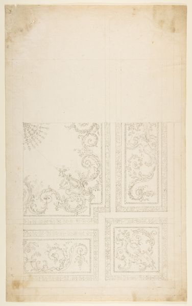 Curator: The work before us is entitled "Seighton Buzzard Church, Ironwork on Door, West Front." It’s an anonymous drawing rendered in pencil, believed to be from the latter half of the 19th century. Editor: The drawing immediately strikes me as precise and ordered, yet with an undercurrent of organic, almost plant-like forms. The repetition of those iron scrolls creates a sense of regulated growth across the surface. Curator: Indeed. Notice the symmetry at play, particularly within each distinct register. There is an equilibrium, but also a delicate variation from one scroll to the next. Semiotically, this suggests a tension between divine order and the complexities of the natural world. Editor: What I find compelling is considering this not merely as representation but as instruction, a tangible step in a making process. A study of how the blacksmith would bend, forge, and join the metal. I wonder about the transfer of this delicate pencil line into the heavy materiality of iron. The labor! Curator: I am captivated by how the artist uses line weight to suggest depth and form. Notice how certain areas are rendered with thicker lines to define shadow and emphasize volume. The geometric framework behind these delicate strokes are fascinating. Editor: The raw quality of the paper itself speaks to the pre-industrial context. A handmade paper shows how material resources dictate the art’s reach; a very specific geography and temporality produced this drawing. I find that aspect really valuable. Curator: I’d offer that within its formal constraints, the artwork speaks of profound themes –faith, craftsmanship and perhaps, through its meticulous structure, something timeless and lasting about art itself. Editor: I'm left considering how we often separate the intellectual act of design from the manual act of making, when this object really collapses that distance and allows a deep investigation into process.