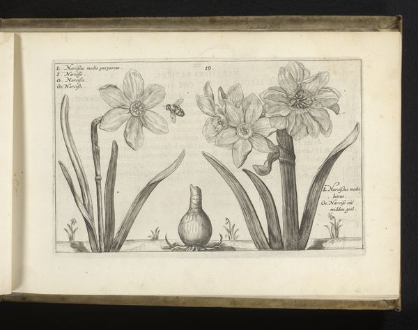 Editor: Here we have "Twee soorten narcissen" – "Two Types of Daffodils" – by Crispijn van de Passe the Younger, created in 1617. It's an engraving, printed in ink on paper, currently held at the Rijksmuseum. I’m immediately drawn to the detail, especially considering it’s a print. What can you tell us about the making of this piece? Curator: Considering van de Passe’s work in the Northern Renaissance, the process becomes paramount. The labor involved in producing these precise lines through engraving reveals a dedication to craft, highlighting the economic value placed on accurate botanical illustration at the time. Think of the cultural need this addressed: the increasing fascination of a merchant class with luxury items such as new bulbs from the East! This image is not just aesthetically pleasing; it is tied to social trends, and material culture, all made manifest through the laborious engraving process. Editor: That’s fascinating. So, the act of creation mirrors the economic and social contexts of the era? Curator: Precisely. Engraving, unlike painting, allows for reproduction. What does this tell us about the intent of this kind of art, versus, say, a unique oil painting? Consider how the printmaking industry facilitated the spread of knowledge and fueled burgeoning capitalist markets. Editor: I guess it moves it away from just being an aesthetic object into something more functional and widely accessible. Did this democratizing element challenge older artistic norms? Curator: Yes! It shifted the understanding of “art” itself, opening a new avenue for distribution that intersected with emerging commercial networks and even scientific exchange. Each print, in turn, fueled consumer demand, establishing new roles for artists. Editor: This has made me see the image in a completely different light. I'd been focusing on the natural beauty, but the layers of material and cultural context you highlighted really broaden the picture. Curator: Exactly. Looking at the artwork through a material lens helps us examine its deeper purpose. It helps unveil hidden societal patterns within the work itself.