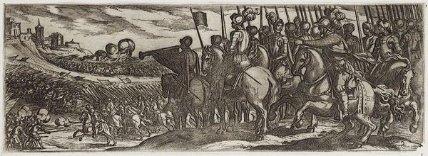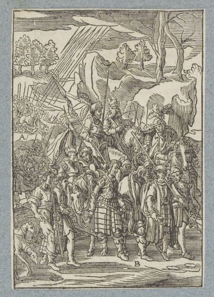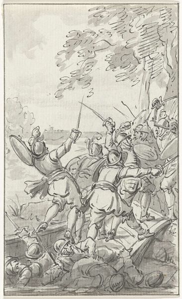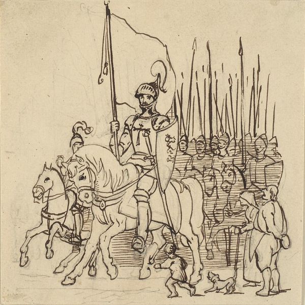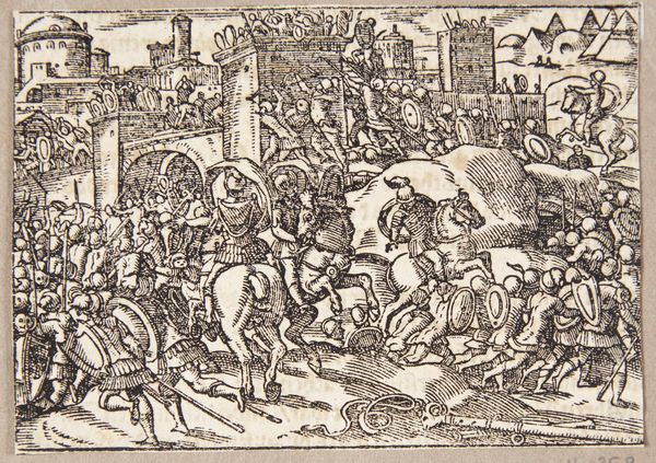Curator: We are now viewing a detail from "Battle Between Heraclius and Chosroes" by Piero della Francesca, a fresco created around 1466. It resides within the Basilica of San Francesco in Arezzo, Italy. Editor: My first impression is the sheer density of the scene. A chaotic jumble of figures, yet somehow rendered with a strange serenity through those pale, almost bleached hues. Curator: Absolutely. Piero employs tempera grassa on a large scale to depict the victory of the Byzantine Emperor Heraclius over the Persian King Chosroes II, a pivotal moment in the early 7th century. The banners in the background symbolize power, with figures rendered almost mathematically. The artist emphasizes geometric forms, offering symbolic interpretation rather than a literal depiction. Editor: Considering that historical context, do you see this representation more as a theological assertion? A medieval power dynamic rendered in paint rather than blood and steel? Curator: Yes, that's very perceptive. These frescoes functioned as visual aids and declarations of power for the Bacci family, who commissioned them for their funerary chapel. Reflect on the way Piero presents movement – or the near absence of it. He uses flat areas of tone and subdued coloration to convey stability and stillness despite the chaotic clash of arms. Editor: But I do appreciate how Piero eschews overt drama. His figures possess an almost haunting impassivity despite the carnage unfolding around them. It feels as though he’s less interested in illustrating violence than in constructing a carefully balanced composition. Curator: Exactly! It's a carefully constructed vision. Notice that flattened perspective, typical of Early Renaissance art, but handled here with incredible skill. The overlapping forms and strategic use of light create depth without sacrificing clarity. Editor: Perhaps the real battle here lies not in the conflict on the field, but in the artist's attempt to synthesize form and meaning in the face of brutality. A noble attempt to transcend the subject matter, I think. Curator: I agree entirely. Through formal control, the artist seeks to deliver this grand narrative by exploring a balance between order and chaos in order to express a message of the triumph of Christianity.