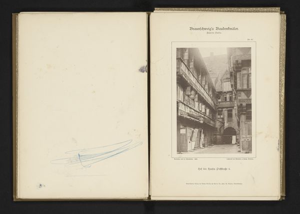 Curator: This photogravure from 1892, attributed to J. Schombardt, offers a look at the Meinhardshof in Braunschweig. It’s a fascinating example of early photographic cityscapes. Editor: Stark and a bit claustrophobic, isn’t it? The perspective, with the buildings looming, creates this almost compressed feeling. The tonality is also very subdued. Curator: Indeed. Photogravure allowed for tonal subtleties previously unattainable in printmaking. What's interesting to me is Braunschweig’s urban development at the end of the 19th century, especially during the rise of German Expressionism. How does this image situate itself within those contexts? Editor: Well, from a purely formal standpoint, the converging lines and deep shadows definitely anticipate some of the anxiety-ridden cityscapes we see later in Expressionist painting. The geometry almost overwhelms the human element. Curator: Precisely! These emerging photographic technologies were capturing the rapid modernization of German cities, which led to alienation and societal shifts, later explored by Expressionists through their visceral style. It documents how modernization literally reshaped space and, as a result, public experience. Editor: You’re drawing out a great analogy between photographic form and that sense of urban dread! For me, the way the light interacts with the cobblestone and architectural details—those dark recesses of the windows and doorways—makes me see that there is also an element of romantic beauty present. Curator: That contrast highlights the dialectic inherent in urban growth. These detailed photogravures also functioned as documents, informing city planning, and, of course, attracting tourists. Editor: Looking closely at the arrangement of forms and shades here has sharpened my perspective on Braunschweig’s history. Thanks for pointing that out. Curator: The beauty of this photograph lies in its simultaneous reflection of urban transformation and documentation of its societal implications. The formal and the historical coming together…always fascinating!