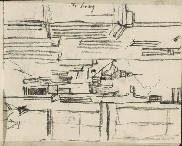 Curator: Standing before us is "Doorkijk vanuit een schuur of boerderij," a pencil drawing by George Hendrik Breitner, likely created between 1883 and 1885. It's currently part of the Rijksmuseum's collection. Editor: It feels like peering into a forgotten corner, doesn’t it? A kind of hushed expectancy, as if the world is holding its breath. There’s a starkness that's beautiful in its raw, almost accidental, quality. Curator: Precisely. Breitner's skillful use of the pencil manifests through distinct areas of light and shadow that really bring form to the rather limited depth of the space. The hatching and cross-hatching create a tonal range, that despite its stark contrasts is balanced rather beautifully. Editor: The way the light just catches the edge of what could be a window frame. It really does suggest that there's life existing outside. It reminds me of my grandmother’s old barn, with all those familiar yet unnameable shapes within a darker volume of space. The texture is fascinating; that density of lines just hums with energy! Curator: That resonates deeply within Breitner’s Realist project, a quest to capture everyday scenes. Consider how he articulates spatial relations via simple geometry: horizontal lines, upright supporting features, the use of the implied rather than overtly descriptive elements of realism. It becomes more of a psychological rather than representational experience. Editor: And I like how the viewpoint is not immediately obvious. Is the artist actually standing inside the barn, peering out? Or is this a memory of what they've experienced and perhaps imagined? It’s that feeling of transient reflection that pulls me in. Curator: In conclusion, this drawing displays Breitner's masterful grasp of tone and composition, converting an unassuming scene into a piece laden with feeling. Editor: Exactly—a quick sketch capable of sparking intense sensory feelings. Art that connects to memory itself is timeless, you know?
