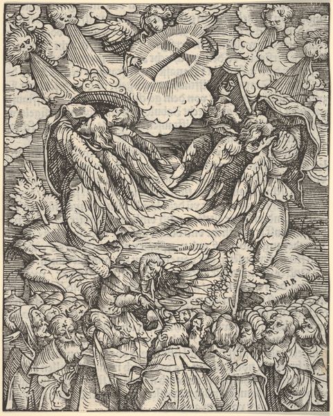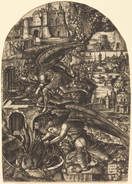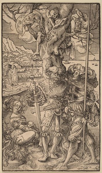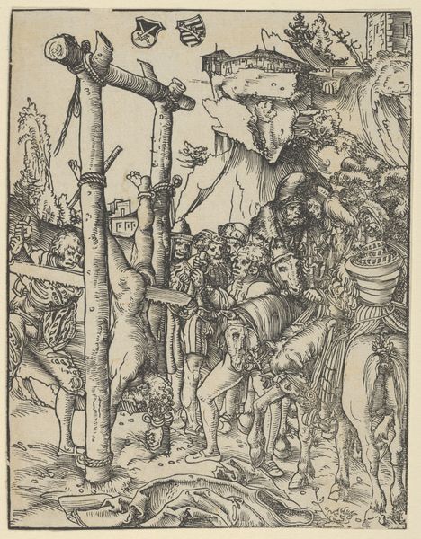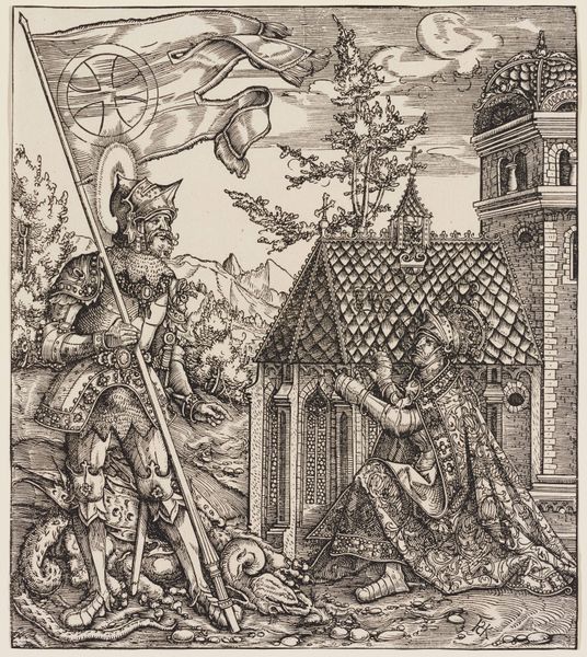 Hans Springinklee made this woodcut, "St George as the Emperor's Patron Saint," as part of a series called "The Habsburg Saints." Made in Germany, around 1515, this print exemplifies the complex relationship between religious devotion and dynastic power. We see St. George, the quintessential knightly saint, standing guard over a kneeling Emperor Maximilian I, who is depicted as a humble supplicant building a church. The image is rich with the visual codes of the Holy Roman Empire, referencing the Habsburg's claim to divine right and their role as protectors of Christendom. The figure of St. George, with his armor and dragon-slaying spear, becomes a symbol of imperial might, while Maximilian's pious act reinforces the legitimacy of his reign. To truly understand this artwork, historians delve into the archives, examining court records, religious texts, and even the personal correspondence of the Habsburgs, to reveal the intricate web of political, religious, and artistic forces that shaped its creation.