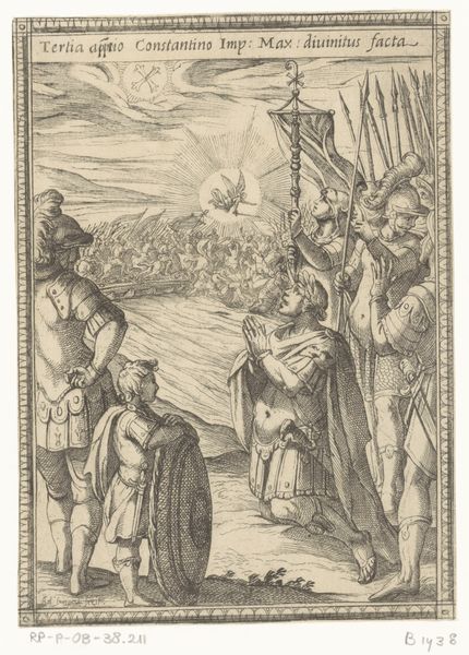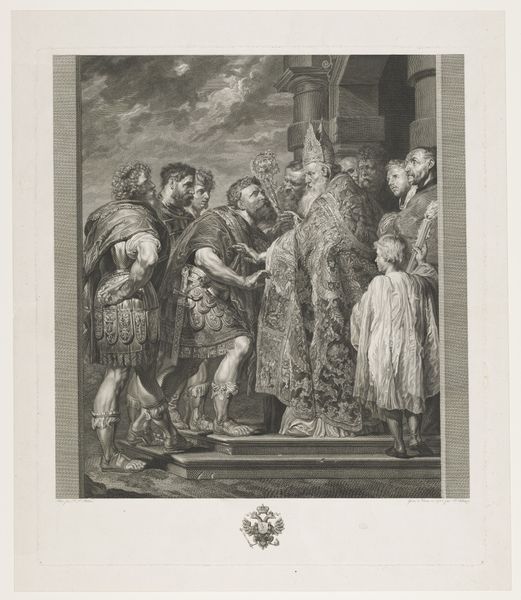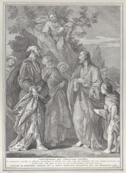 Curator: Jean Baron created this engraving, titled "Romualdus van Ravenna met zijn volgelingen," some time after 1655. It depicts Romualdus of Ravenna with his followers. What strikes you most immediately about it? Editor: The stark linearity. It’s so graphic. The landscape in the background almost has a fantastical quality. What era are we considering with its placement of figures? Curator: We see this work arising in the Baroque period, where grand narratives, dramatic scenes, and emotional intensity were favored. Consider that against the backdrop of the Counter-Reformation and the efforts to reaffirm religious authority through art. This piece might function within those concerns. Editor: Baroque engravings offer unique challenges and possibilities. I'm looking at the foregrounded figures of Romualdus and his followers – observe how Baron delineates the fabrics of their robes and the faces in great detail, how this is offset by a hazy almost dream-like portrayal of the monks in the background. It feels carefully considered. Curator: Precisely. It is history painting rendered through a particular lens. Romualdus was known for founding the Camaldolese order, a branch of Benedictine monasticism. He lived a life dedicated to solitude and reform within the Church, which can tell us about the values Baron is seeking to affirm in this portrait. Editor: There's such careful play of light and shadow in the work too, which draws me to it all the more. The hatching technique truly brings volume to their forms in these simple white robes, with their tonsured heads drawing me to study them more. What more can you say of this order of monks, though? Curator: The order was known for its emphasis on both communal and solitary life, balancing these aspects in its monastic practices. Within this piece, we observe the historical power structures between the religious orders, society at large, and the visual cultures of the time, with specific implications for gendered representations and the broader intersectional narratives that defined the epoch. Editor: Thank you for shedding some light onto Baron's narrative; I must admit I got utterly swept up in the craftsmanship. Curator: No, thank you. Thinking of this moment in history offers unique insights when regarding Baron's figures.