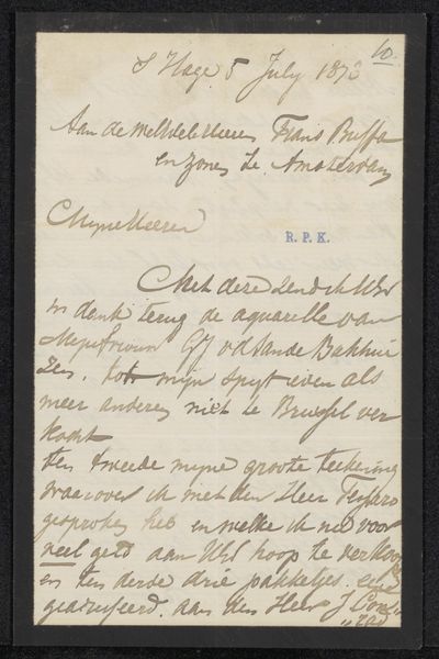 Curator: Pieter Stortenbeker’s “Brief aan Frans Buffa en Zonen,” dating possibly from 1872 to 1876, catches my eye immediately. There's a raw, intimate feel to it, almost voyeuristic in the sense that we’re viewing a private correspondence. Editor: Indeed. Drawn with ink on paper, currently residing at the Rijksmuseum, this letter presents itself less as a grand artistic statement and more as a fleeting moment captured. I find the calligraphic elements to be particularly compelling when thinking about issues surrounding access to literacy, gender, class, and historical power structures of communication in 19th-century Dutch society. Curator: Absolutely, but I also think we can appreciate the aesthetic value without solely situating it within historical power dynamics. It invites us to consider the material conditions of art creation—the artist, their tools, the context of artistic communities within 19th century Europe, where such dialogues were common. It serves as a lens to view networks and artistic movements. Editor: That’s precisely what is missing here! To isolate it purely on its formal qualities neglects a vital discourse concerning Dutch nationalism and intellectual property and the role art dealers like Frans Buffa en Zonen played. It is necessary to acknowledge how such artifacts reflect broader narratives around the distribution of knowledge and cultural authority in a period marked by burgeoning publishing industries. Curator: I acknowledge your points concerning larger systemic influences. What moves me is simply the tangible nature of ink meeting paper; that immediacy transcends contexts for me, hinting at human vulnerability expressed on vellum in moments of candid disclosure, perhaps with anxieties revealed by the penmanship and grammar that hint at education as privilege and access in itself—as material acts within a capitalist culture centered around scarcity as it applies to everything. Editor: Then, considering it from these critical standpoints offers us the unique potential for the letter to foster new lines of discussion about authorship, social identity and modes of economic exchanges shaping creative pursuits then versus current manifestations and expressions of agency and selfhood by a 19th century person named "Pieter Stortenbeker," writing intimately to peers about real events occurring. Curator: Precisely, let us keep in mind that historical dialogues like this provide essential windows toward deeper reflections of cultural capital, power constructs around artistic distribution, etc., thereby making space for transformative discourse across disciplines of studies.