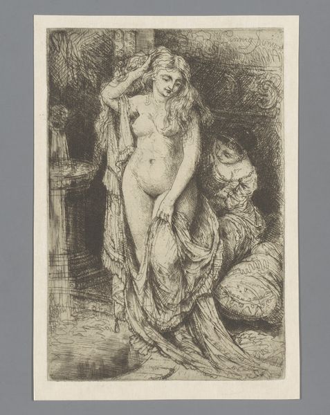 This is Paul-Albert Besnard’s etching "Possession", and though undated, it probably comes from his late 19th-century period, made in France. The scene depicts a nude woman, seemingly lifeless, with skeletons hovering around her. This image is very much in keeping with its time. It's a period that saw the rise of Symbolism in art. The focus was on conveying complex ideas through metaphorical imagery. "Possession" seems to engage with themes of mortality and decay. We can also think about the title, and what it might say about the social status of women at the time. Are the skeletons metaphors for male dominance? To understand Besnard's work better, we might explore the artistic circles he moved in, the exhibitions he participated in, and the critical responses to his art. What was the cultural context that gave rise to this rather macabre, yet compelling, imagery? This would provide a richer understanding of its meaning and significance.