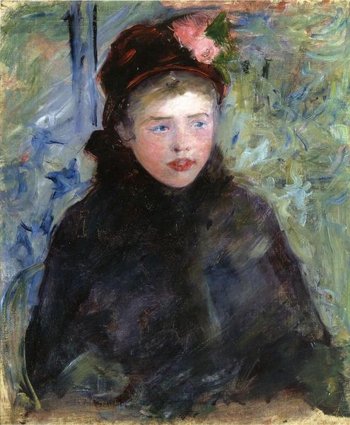 Curator: We are looking at Berthe Morisot's "Young Girl with Doll," an oil painting from 1884. It currently resides in a private collection. Editor: Ah, yes, a cozy scene. I love the sense of intimate space Morisot captures. It's almost as if we're intruding on a private moment between a child and her favorite toy. Curator: Indeed. The composition is quite striking. Notice how Morisot uses loose brushstrokes and a limited palette to create a sense of immediacy. The positioning of the girl within the chair, the way the doll is clutched—these visual elements converge to communicate volumes about childhood experience. Editor: You're right about the brushwork. It feels unfinished, like a fleeting impression, but that adds to its charm, doesn't it? And there’s something incredibly vulnerable in the girl’s gaze, reflecting that curious innocence. It is very pure! I mean, she seems very contemplative. What is she thinking about, I wonder? The color around the flowerpot seems very cold but this enhances the subject's innocence in contrast. Curator: Precisely. That impressionistic technique, though seemingly spontaneous, is carefully constructed. The lack of precise detail draws the viewer into interpreting the girl's emotional state. The light also plays an important role, dappling across the scene and heightening the sense of transience. Editor: I especially like how the textures clash – the floral pattern of the armchair almost seems to be competing with the girl’s presence, and her stiff, buttoned-up clothing, with the soft texture of the doll. Almost gives me a sense of a tiny grown up, stuck in between adulthood and childhood. And all of that with colors which seems diluted by water, so evocative of feelings... Wonderful. Curator: An astute observation! Morisot masterfully uses those visual tensions to subtly suggest the complexities inherent to childhood, between rigid structure and fluidity of innocence. I read those tensions within a historical and biographical context too; this adds an undeniable dimension to the analysis of color relationships. Editor: Fascinating! All this has completely changed how I see this piece. The child looks less innocent, somehow—perhaps aware of being on display, performing a kind of innocence, herself a piece of precious property—a girl with a doll. Curator: Well, it seems that careful formal analysis allows for fresh understanding and also makes us open to new dimensions, in dialogue with your perspective. Editor: Yes! This all invites contemplation, indeed, on those private moments that quietly build up one's experiences as an individual.