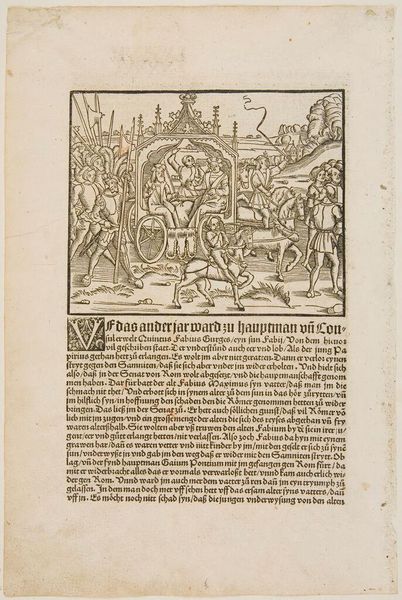 This woodcut, made by Bernard Salomon around the mid-16th century, presents scenes from the biblical book of Kings. The composition is structured around a series of rectangular panels, each densely filled with figures and landscapes rendered in a high-contrast black and white. The use of hatching and cross-hatching creates a rich surface texture, emphasizing the materiality of the print. The organization of the page into discrete narrative units invites a structuralist reading, where each panel functions as a sign within a larger semiotic system. Salomon's strategic use of line and form creates a sense of depth and movement, guiding the viewer's eye through the complex scenes. The repetitive use of certain motifs, such as trees and buildings, suggests an underlying order and symbolic resonance. The stark contrast between light and dark serves not only to define forms but also to evoke a sense of drama and moral clarity, reflecting the religious and cultural context of the Reformation era. This emphasis on form and structure invites us to decode the underlying principles that govern both the artwork and the world it represents.