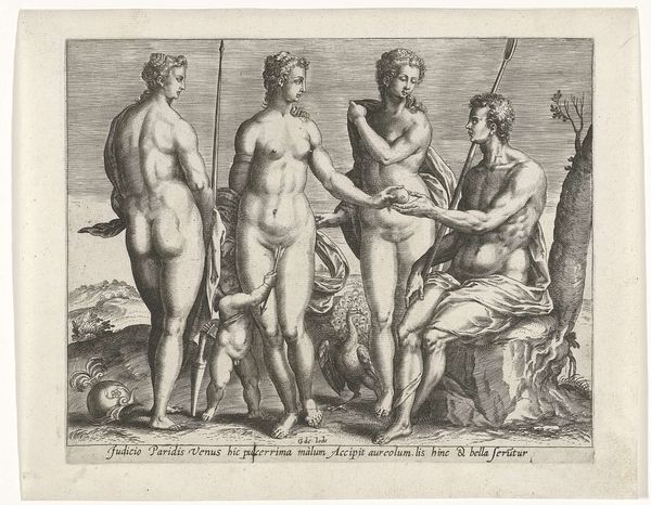 Editor: This is "Liefde in het Gouden tijdperk" or "Love in the Golden Age" by Agostino Carracci, dating back to around 1589-1595. It's currently at the Rijksmuseum. Looking at the engraving and etching, I’m struck by the active poses of the figures; they’re interwoven in such an intense and, dare I say, performative way. What is your interpretation of this piece? Curator: The density of bodies and layering of erotic poses indeed creates a distinct impression, doesn't it? Beyond the immediate physicality, it's essential to unpack this 'Golden Age' allegory through the lens of 16th-century social structures and power dynamics. Think about how the male gaze operates here, how it positions the female body, and how ideas around reproduction intertwine with social constructs of desire. What statements, then, does Carracci’s construction of pleasure and abundance say about the power structures and the place of gender within that era? Editor: So you're saying the seemingly carefree abandon is actually a coded representation of power? It's interesting to consider that even idealized scenes like this were staged, shaped by the prevailing social norms, rather than some purely free expression of love. Curator: Precisely. The Golden Age is presented through the male gaze, which invites questions around access to pleasure and who controls that access. The abundance suggests both a hope and perhaps also a subtle anxiety around lineage and social control. What do you make of the cupids? Are they witnesses or active participants? Editor: I see them more as...commodities, reinforcing that the only goal in a partnership between two people would be procreation. And if that is true, one has to question whether either party has any autonomy at all, particularly the woman. Curator: Your analysis of how these visual choices are used to suggest that production-line style manufacturing of new citizens aligns with a much darker possible statement. And so, by analyzing this popular artwork using current perspectives and social mores, we are actually able to discuss how different times have various views. Editor: That is thought-provoking. Looking at this artwork, I now see the need to think about who this 'Golden Age' was *actually* golden for, and to recognize the voices perhaps left out of the narrative.