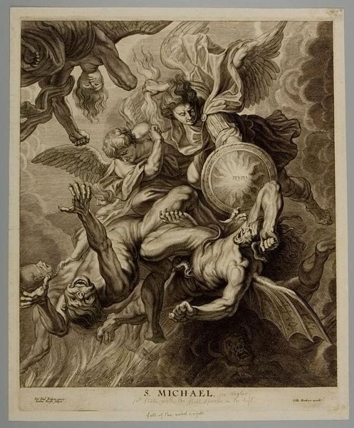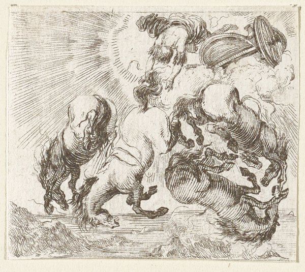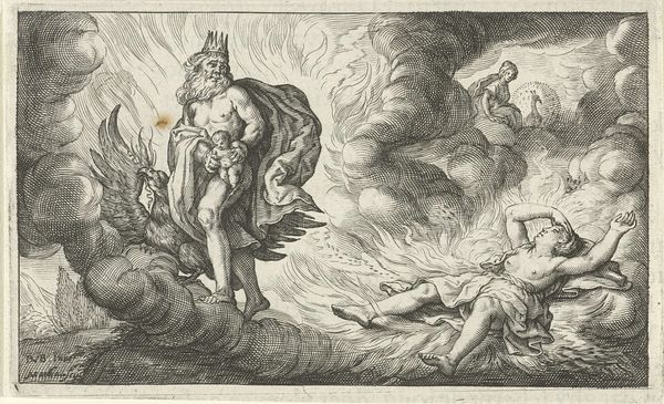 Curator: Well, here we have Cornelis Schut's "Boreas en Oreithyia," likely created sometime between 1618 and 1655. This print is part of the Rijksmuseum's collection. Editor: My first impression is a kind of turbulent dream. There’s this frantic energy to the abduction scene, softened, though, by the floating cherubs. Curator: Indeed. Schut captures Boreas, the north wind, seizing Oreithyia. The tale originates from Greek mythology; Oreithyia was a princess of Athens who rejected Boreas, leading him to simply…carry her off. It became a very popular story with the advent of the printing press. Editor: Right, you can see how this depiction fits into that older visual language. Boreas, despite his aggressive act, has the expected iconography, with the wind blowing back his wild, unruly hair, so he appears quite…majestic even. And Oreithyia’s gesture… it mirrors classical representations of frantic nymphs being pursued. It is as if the terror of the situation is conventional. Curator: And isn't that the point, to a degree? Artists from this era frequently deployed classical narratives to comment on social and political realities. An abduction could be viewed as allegory for foreign policy, a critique of power structures. Editor: That rings true. Plus, there's the obvious element of lust involved here, given the sensuousness of the figures; which introduces layers of tension and desire that seem, dare I say, socially acceptable with such imagery. Are there certain meanings tied up with north winds that come into play, that give them their dangerous associations? Curator: Absolutely. The north wind, often bitter and forceful, came to represent raw power and even untamed desire. We might consider the image’s contemporary reception and recognize that it touches upon the societal roles, ideas of masculinity, and power relations prevalent then. Consider that the printing press allowed this idea to permeate to wide audiences! Editor: So even with such a seemingly fantastical scene, we can still find echoes of the era’s politics, gender roles, even subconscious anxieties reflected back at the viewer through recognizable symbolism. Curator: Precisely! It reveals how historical forces can intertwine even with seemingly timeless myths. Editor: A story isn’t just a story then…It is a fascinating glimpse into cultural narratives from centuries ago that shape what we consider familiar or acceptable.