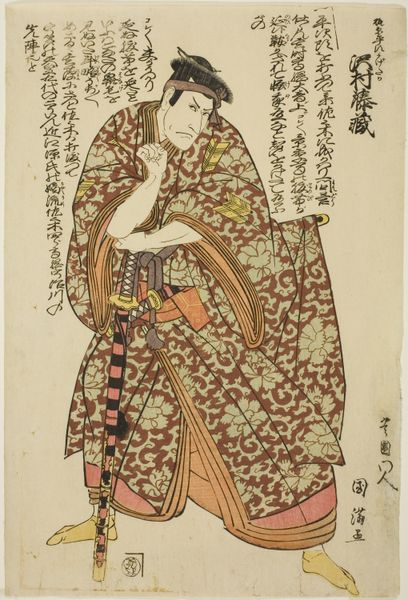 Curator: This is a woodblock print by Torii Kiyomitsu, created sometime between 1747 and 1767. It depicts the actor Segawa Kikunojo II in the role of Tegoshi no Shosho. Editor: There's something immediately captivating about the pattern work here—the layered textiles, each subtly different, feel so rich despite the relatively limited palette. It's got a wonderfully elegant flow. Curator: Absolutely. Kiyomitsu, part of a lineage of artists connected to the Torii theatre, was really instrumental in solidifying the style of *ukiyo-e* prints focusing on actors. Editor: The floral motifs, especially on the sleeves, catch my eye. White plum blossoms perhaps, symbols of resilience and renewal. It speaks to the fleeting nature of performance, capturing a moment that is eternally re-blossoming, even after the curtain falls. Curator: That interpretation works well. These prints served an important function – almost like theatrical publicity. They circulated widely, shaping public perceptions of both the actors and the roles they embodied. Theatre was, after all, a really important cultural space. Editor: You know, the gentle slope of the figure and positioning of the hands remind me almost of depictions of Buddhist deities bestowing a blessing, perhaps suggesting how culturally important actors like Kikunojo II truly were. And consider that it's Segawa Kikunojo II. He became quite renowned for playing both male and female characters. What cultural values were embodied in his ambiguous stage personas? Curator: Indeed, thinking about it in terms of gender and performativity brings added depth. Segawa's celebrated *onna-gata* roles challenged rigid societal expectations. That liminal space he occupied, through his craft, challenged norms and played with perceptions, influencing how identities were perceived at the time. Editor: Seeing this piece really helps connect how people viewed theatre, the symbols people responded to, and the society as a whole. Curator: The woodblock print gave that access, providing a valuable visual link between stage, artist, and the broader audience that circulated ideas within society.
