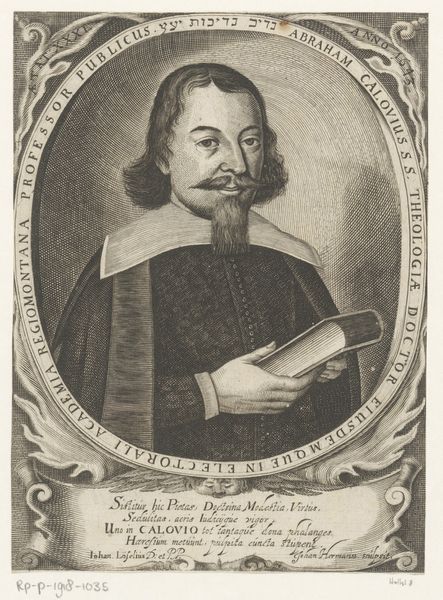 Curator: Here we have a rather striking engraving, "Portret van Salomon Möller," likely created between 1687 and 1693. It's currently held in the collection of the Rijksmuseum. Editor: My first impression is one of serious contemplation, but there's a hint of warmth too. The circular frame gives it a sense of focused attention. What draws me in are those intelligent, somewhat melancholic eyes. Curator: It's compelling, isn't it? The visual language here aligns with that of Baroque portraiture. It reflects Möller's role, situating him within the political and intellectual contexts of his time. He was, after all, a pastor and scholar. His clothing and the Latin inscription denote status. Editor: Precisely! The inscription, the dark robe, and the crisp white collar all signal Möller's place in the world, but so much more can be gleaned from it! The textures, achieved through engraving— the dense cross-hatching to create shadow, it all builds to the weight this man must have carried, his dedication. I keep wondering what particular belief he dedicated his life to in this era of upheaval. Curator: I'd agree, the technique mirrors his inner character as presented. One thing I can’t get away from are the constraints he must have been under as a man of God during that historical time. Was he conflicted with certain societal expectations? What sort of societal change did he champion through the church or maybe get suppressed by? It all seems worth researching to understand him better. Editor: It is absolutely worth considering the weight and complexity in the portrait’s symbolism, beyond a simple surface-level assessment of it being Baroque. The image seems meant to convey both a general sense of piety and a more individual impression of the man. The text accompanying it, though classical in its tone, attempts to humanize Möller and signal towards the complexity of his legacy in a way we can't simply assume without further investigation. It’s worth interrogating, wouldn’t you say? Curator: Absolutely. By deconstructing such iconic visuals and texts within artworks like this, we start to see a much richer, and often much more contradictory, picture of that historical moment in time. It invites us to think about our values. Editor: Indeed, looking at his representation is ultimately to question the narrative we've inherited.
