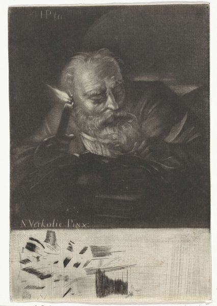 Hendrik Pothoven created this print of an old man reading by candlelight. The composition is dominated by a stark contrast of light and shadow, characteristic of chiaroscuro, evoking a sense of drama and introspection. The singular light source, a candle held close to the man's face, casts deep shadows that obscure much of the background, drawing our attention to the illuminated details: the wrinkles etched on his face, his concentrated gaze, and the delicate pages of the book. Pothoven employs the formal elements of light and shadow to explore themes of knowledge and mortality. The flickering candle, a symbol of enlightenment, is juxtaposed with the encroaching darkness, suggesting the ephemeral nature of life and understanding. The overall effect is a meditation on the power of knowledge to illuminate the human condition, even in the face of life's inherent uncertainties. Note how the artist has used line and texture to create a rich and complex visual field, inviting us to contemplate the relationship between light, knowledge, and the passage of time.