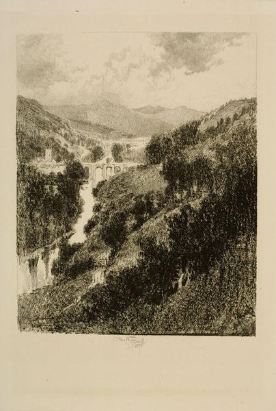 Editor: This is "At Five Ponds, North Waterford, Maine," a pencil and charcoal drawing by Edward Seager, created in 1845. It strikes me as quite serene, almost photographic in its detail for the time. How do you interpret this work through a more critical lens? Curator: What captures my attention most is the rigorous application of chiaroscuro. Observe how Seager employs contrasting light and shadow not merely to depict form, but to construct depth and atmosphere. The precision of line in the foreground yields to a softer, more diffuse treatment in the distant mountains, manipulating the viewer's perception of space. Editor: So the value and contrast choices really structure the whole picture? Curator: Precisely. Consider also the composition: the careful arrangement of the trees, the positioning of the lake, and the placement of the mountains. The formal relationships among these elements guide the eye and create a visual rhythm. It's a calculated orchestration, not a simple transcription of nature. What do you notice about the tonal scale itself? Editor: It appears very consistent, almost a study in grays alone, without much pure white or black. Curator: Yes, a restricted palette which encourages a focus on texture and subtle gradations in tone, allowing us to appreciate Seager’s mastery of his medium. In its very refinement and dedication to mimetic precision we see a meditation on the act of seeing. Editor: I see, by focusing on the form itself, we understand the artist's careful control and intentionality. I initially saw a pleasant landscape, but now I appreciate how constructed and considered it is. Curator: Exactly. By analyzing its internal components, we can move beyond a purely representational reading. It demonstrates how attention to the pictorial elements can illuminate the deeper ambitions of the artist.