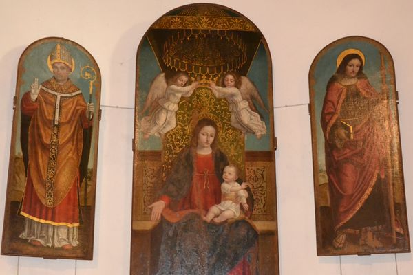 Curator: Here we see Ambrogio Bergognone’s “Polyptych. Madonna and Child, Saint James the Great and Saint Henry,” painted around 1484, rendered in tempera on panel. Editor: Immediately striking, isn’t it? The figures possess a gentle solemnity. I'm drawn to the somber color palette and almost naive simplicity in the characters' representation; they give a great sense of humbleness and quiet strength. Curator: Absolutely. These polyptychs, especially those found in churches, functioned as visual anchors, shaping communal identity and reinforcing the power structures within the religious hierarchy. Bergognone's position in the late 15th-century Lombardy gives insight into this moment, where we can observe that political influence of the Church started do diminish Editor: Indeed, the very format of a polyptych is inherently hierarchical, especially at that moment of political tensions. We might even consider the Madonna's central placement through the lens of intersectional feminism, interrogating how it upholds or subverts the era's patriarchal power dynamics within sacred imagery. I wonder, was the positioning of the Saint James and Saint Henry at the same hierarchical level? Curator: That is interesting. Notice how the background has very minimal depth, which situates the work more in line with earlier medieval devotional panels than with the humanistic perspective taking hold elsewhere in Italy during that time. The materiality itself contributes to the artifice; we are acutely aware these are constructed representations. Editor: Precisely! Tempera’s quick-drying nature leads to meticulously blended, yet firm, brushstrokes, creating figures which convey a very precise image. It's fascinating how artistic techniques can either perpetuate or challenge pre-existing social paradigms. Considering that Bergognone had no need to pursue depth in this work, he must be interested in how he portrayed the different actors. Curator: The institutional demand from patrons greatly conditioned artistic choice back then, indeed, but if you look closely at the artwork through its social framework, you'll note how artistic style has a tendency to favor popular narratives that reinforced their base power structure, as we previously discussed. Editor: Examining “Polyptych. Madonna and Child, Saint James the Great and Saint Henry” reveals that the function of the Church can provide insights into the beliefs and values held by its artists. Thank you for illuminating its many sociopolitical textures. Curator: And thank you for opening avenues for us to further explore what makes up society itself!