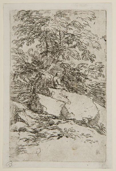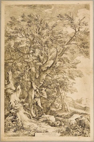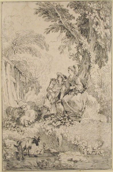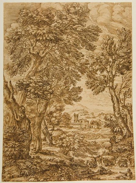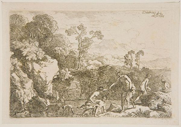 Curator: Jacobus Coelemans, born in 1654, created this pen and ink drawing, "Tobias and the Angel," now held at the Harvard Art Museums. Editor: It feels immediately intimate, almost like witnessing a private encounter. The delicate lines suggest a vulnerability, wouldn’t you agree? Curator: Absolutely. The subject matter is drawn from the Book of Tobit, where the angel Raphael accompanies young Tobias on a journey. It’s a narrative steeped in themes of healing, guidance, and divine intervention. Editor: Notice the prominence of the fish, its symbolism carries significant weight. In many traditions, the fish is a symbol of abundance, fertility, and spiritual transformation. Here, it connects to the healing of Tobias's father's blindness. Curator: The river scene itself acts as a location for symbolic cleansing. But from a modern perspective, the angel's intervention raises questions about agency, power dynamics, and how we frame the idea of assistance. Editor: It's amazing how a simple drawing can contain so many layers of interpretation. Thanks for guiding us through those complexities. Curator: My pleasure. It’s a reminder that art, even from centuries ago, can prompt us to rethink our present.