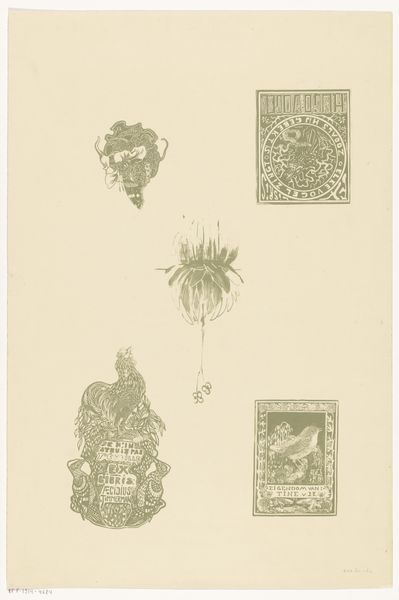 Curator: Here we have a fascinating glimpse into the artistic process. This is a work by Carel Adolph Lion Cachet, titled 'Design for ex libris of Johannes Henoch Neethling, and two other designs'. Created sometime between 1874 and 1945, this sheet holds a collection of ink drawings on paper. It resides in the Rijksmuseum's collection. Editor: It feels like peering into a private sketchbook. The different images are striking in their geometric and organic contrasts—there is almost something slightly mystical in this array of early design explorations. Curator: Absolutely, the Art Nouveau style is strong here, especially in the curvilinear plant motifs that fill one of the proposed bookplates. Notice the bold typography incorporated—how might typography function symbolically, expressing both individuality and institutional power? Editor: The script on the lower-right is so fascinating. Given how rooted in South African history the text clearly seems, I can see a clear tension between individual book ownership versus the academic institution laying claim to learning and literature through images such as these. It’s an assertion of cultural presence. Curator: Precisely. An ex libris, a bookplate, is a mark of ownership and taste, an emblem linking the owner to the book's contents. I read the stylized geometric shapes as an attempt to impose order, classify the intangible knowledge captured between book covers. Editor: I also appreciate that all these designs hint at the broader market culture for print material at the time. Considering its materiality, one also recognizes the socio-economic realities of the early 20th century book market, the value placed on graphic art to visually brand and differentiate reading material from competing businesses or even national viewpoints. Curator: Cachet so beautifully balances commercial imperative with the impulse for aesthetic delight. One must also consider the larger forces around cultural heritage preservation when analyzing these objects. Editor: These studies act as tiny portals. Beyond aesthetics, Cachet offers a quiet lesson in design—his creative method involved wrestling with how best to frame identities in times of grand societal shift.