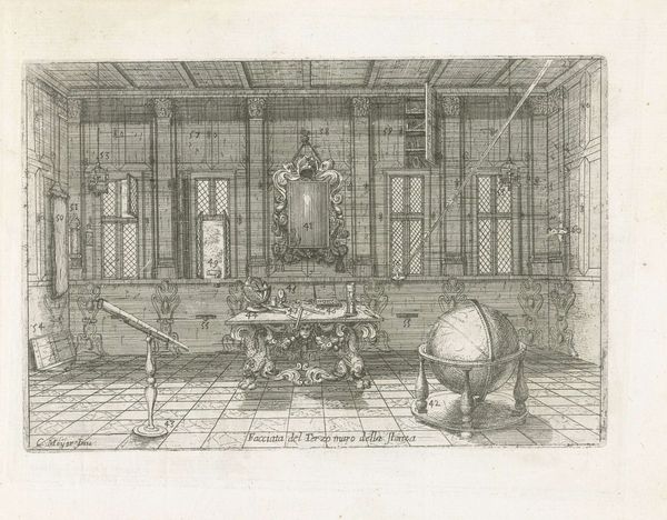 Curator: This detailed engraving, "Kamer van de ambassadeurs van de keizer en de keurvorsten in het Huis ter Nieuburch in Rijswijk, 1697", by Jan van Vianen, shows a fascinating moment in history. Editor: It strikes me as quite stark. The overwhelming impression is the geometry—all those receding lines converging. And that highly detailed wallpaper adds to the tension. Curator: It's certainly precise. Engravings depend on skilled labor; each line meticulously etched, controlled by the artist. This medium allowed for dissemination of imagery related to the treaty being discussed here. Consider how many copies could be printed and distributed, influencing public perceptions of power and diplomacy. Editor: Yes, the dissemination is key. It offers insight into how the Peace of Rijswijk was being framed, literally, for the public gaze. It transforms a real historical event into a mediated image, shaped by the artist and, of course, by the socio-political climate of the era. Curator: We see the trappings of power - the high ceilings, patterned wall paper and furniture design elements, serving as the stage upon which political actors play out treaty negotiations to signal both dominance and perhaps negotiation or compromise. What stories do these opulent chambers communicate through materials and craftmanship? Editor: Right, what story is being crafted around this process and presentation? The historical implications are pretty intriguing when we consider art’s role in shaping political narratives and influencing power structures. This image would have been shown far and wide; solidifying particular viewpoints regarding the treaties for people near and far! Curator: Looking closer reveals the artist’s emphasis on the labor involved and skilled use of materials like copper. What labor was required to manifest the original location and translate to an etched recreation? A highly material exercise, in labor, copper, paper and ink for mass production and a controlled image that extends beyond craft! Editor: Absolutely. It makes one appreciate how visual art, particularly something like an engraving meant for wide circulation, became an integral tool of statecraft and public image making at the end of the 17th century. Curator: Indeed, it really invites consideration about access, craftsmanship and the politics of dissemination during the period. Editor: And it certainly compels us to think more deeply about the role of images, particularly meticulously crafted ones like this, in shaping the course of history.