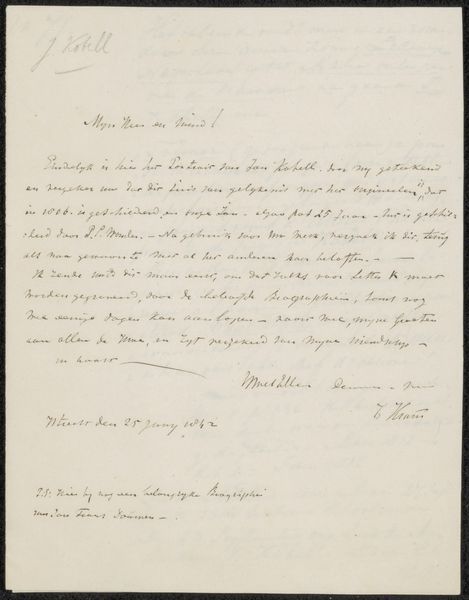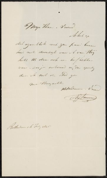 Curator: "Brief aan Adrianus David Schinkel," possibly from 1828, by Johannes Christiaan Schotel. It is an ink and pen drawing on paper. It's compelling to consider that the act of writing itself becomes the art. What do you notice about the letter's form and its visual components? Editor: The visual weight seems to be really dense at the top and the bottom where it’s signed. The flow of the writing has a textural quality, almost like landscape, or a tightly woven textile. What do you see when you look at the shapes and lines in the writing? Curator: Exactly! Consider the balance Schotel achieves despite the asymmetry of the handwritten text. Notice how the deliberate strokes of the signature act as an anchor, a formal grounding contrasting the cursive script. Can you see a rhythm or pattern created by the ascenders and descenders of the letters? Editor: I see that! There are vertical thrusts, kind of like masts on ships, then sinking curves underneath, which create an interesting play with height. It’s almost like he’s constructing a visual poem on the page. Do you think Schotel was consciously playing with this aspect when writing it, given that he was a marine artist? Curator: That's astute. Even within something seemingly utilitarian like a letter, an artist's inherent sense of composition emerges. The negative space is not merely a void but an active element contributing to the artwork's overall aesthetic effect. The relationship between these black and white elements makes for a compelling composition. Editor: So it’s less about the content of the letter and more about the artistic choices behind its creation, even when those choices may not have been completely intentional? I see it now – thanks for pointing it out! Curator: Precisely. By analyzing formal qualities, we unlock dimensions of meaning, revealing an underlying order and deliberate design in what initially seems like a mundane object. It highlights the inherent artistic intention that permeates every aspect of artistic expression.