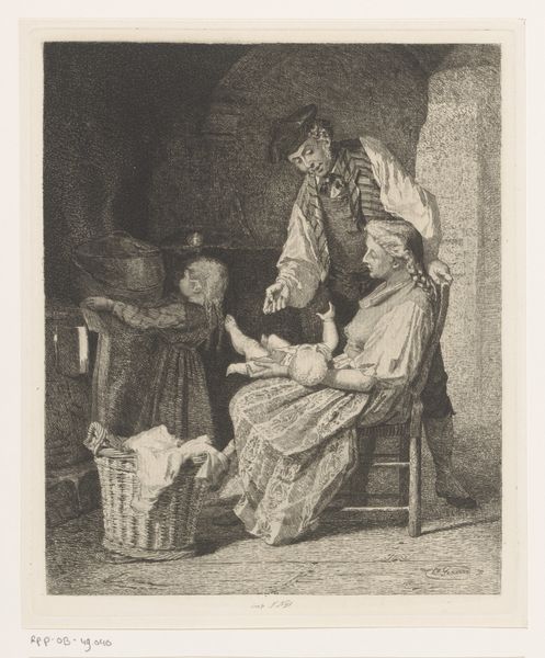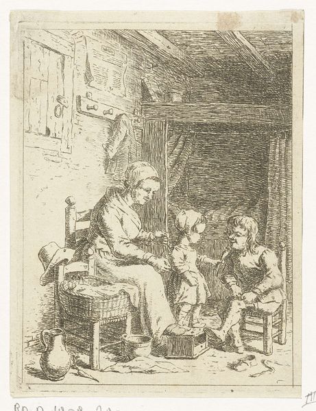 Curator: The etching before us, created by Adriaen van Ostade between 1647 and 1652, is entitled "Brillenverkoper en een oude vrouw," which translates to "The Spectacles Seller and an Old Woman." It's currently held here at the Rijksmuseum. Editor: My initial feeling is of peering into a hushed, secretive transaction. There's a curious mix of dimness and intense activity; like light filtering into a room full of unspoken needs. Curator: Indeed. The composition is structured through light and shadow, with a central, brightly lit figure contrasting sharply with the darker background. Ostade masterfully employs hatching and cross-hatching to suggest textures. Editor: The old woman, perched in that doorway...almost as if she's a bird in a nest. There's such wonderful weariness etched into her face – every line speaks of a long life seen in blurry focus until this peddler arrived. What do you suppose Ostade wanted to communicate here? Curator: Perhaps a comment on the commerce of daily life, a brief interaction highlighted against the mundane. The spectacle seller's wares are, literally and metaphorically, tools for improving understanding, or at least improving sight. It's worth remembering that genre paintings of this sort were fashionable at this period, capturing fleeting glimpses of ordinary life for the entertainment of middle-class people. Editor: It makes you think, doesn’t it? I mean, she's handing over what? Some meagre coins earned with such effort, for a bit of clarity. Does she see herself clearer after all these years? It makes me reflect on vision as metaphor for seeing truths, hard earned as life shifts shapes... I see her squint into time like my own aging. Curator: Ostade provides these narratives using form itself; the lines create the characters' aged and rugged appearance, their poverty suggested rather than overtly stated, thus providing social context but without being heavy handed. Editor: There is a kind of dignity that the picture exudes in such understated way that captures my attention. All three human elements create an entire drama. To make all three work, it could well capture everyday Dutch life. Curator: Exactly. Ostade’s close study, attention to lighting, and ability to use graphic techniques elevate the commonplace into something meaningful. This artwork gives such insight to our life in relation with the rest of us, as it provides with such careful lines how we relate in so fleetingly simple terms. Editor: In that light I feel as the spectacles might sharpen not only physical vision, but our own awareness in seeing each other as humans. What has been exposed in all our dialogue offers light on how we receive this, and offer perspective to the museum visitor as well.