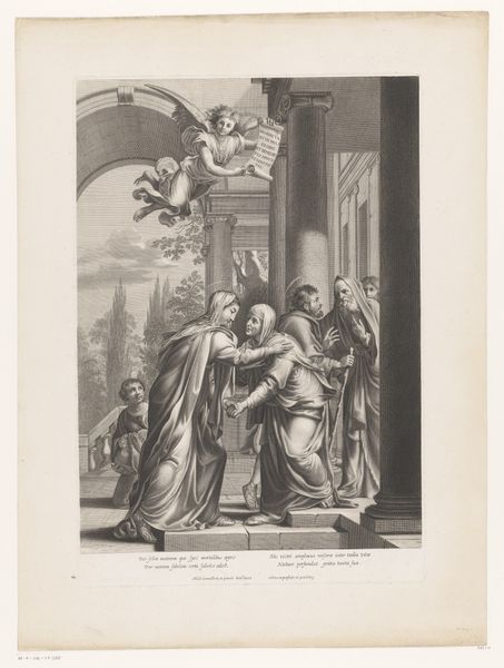 Louis Surugue created this print, "Christ Healing a Blind Man," using etching techniques. The composition centers around a moment of dramatic encounter, rendered in precise detail. Notice how Surugue uses line and form to guide our eyes. The architectural backdrop provides a structured, almost theatrical stage, setting off the organic arrangement of figures. Christ, centrally positioned, extends his hands towards the kneeling blind man, creating a focal point that is both visually and narratively powerful. The gazes and gestures of the surrounding figures all converge on this interaction, reinforcing the scene's emotional and spiritual intensity. The medium itself, etching, lends a unique texture and tonality to the work, the cross-hatching adding depth and shadow. This is not merely an illustration but a constructed space where light and shadow play critical roles in enhancing the theological implications of sight and insight.