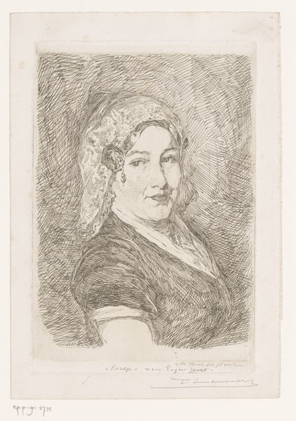 Paul Adolphe Rajon created this etching of Suzanna Rose in 1861 using a metal plate and acid. Etching is an indirect intaglio process. The plate is covered with a waxy, acid-resistant ground. The artist then scratches an image into the ground with a needle, exposing the metal. When the plate is immersed in acid, the exposed lines are "bitten," creating grooves. The longer the plate stays in the acid, the deeper the lines become, and the more ink they will hold. The act of etching, then, is not about physically forcing an image into being, as with engraving, but rather setting up a chemical reaction and letting it do the work. It's a subtle art of control and release, very different from other reproductive processes. The resulting print offers a soft, velvety texture that captures the delicate details of Suzanna Rose's features and lacy bonnet. Considering the material properties and the etching process, we gain a deeper appreciation for its artistic skill.