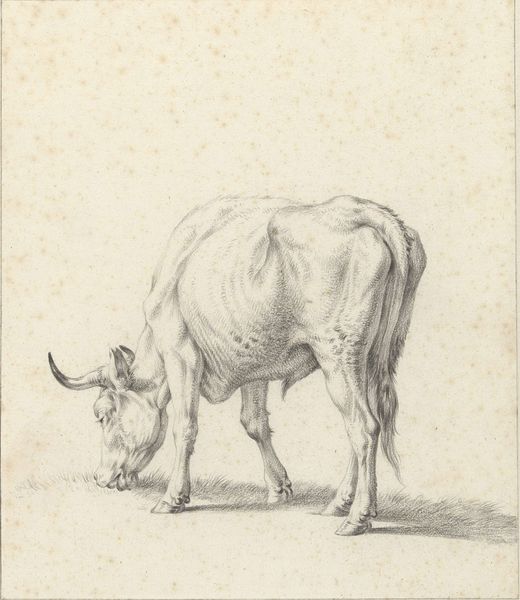 Diederik Jan Singendonck’s etching, "Zich oprichtend kalf," captures a calf in the midst of rising, its form rendered with delicate yet assertive lines. The monochrome palette emphasizes the materiality of the etching, drawing our attention to the varying densities of the marks that define the calf's muscular structure and the texture of its coat. The composition balances the calf’s bulky form with the open space around it, creating a tension between presence and absence. Note how Singendonck uses the technique of chiaroscuro to model the calf's body, enhancing its three-dimensionality. This play of light and shadow contributes to a dynamic quality, suggesting movement and vitality within the static medium. The upward orientation of the calf challenges our expectations, and, in this act of rising, the artist seems to reflect broader themes of emergence and transformation. The image is not just a depiction of an animal, but also an exploration of form, light, and the very act of representation itself.