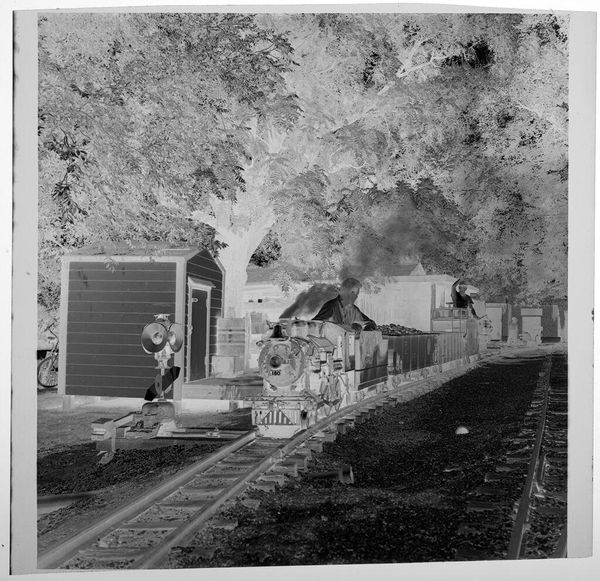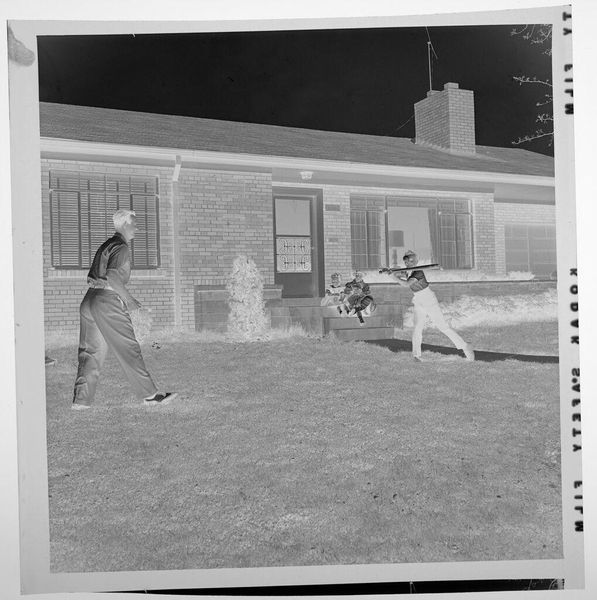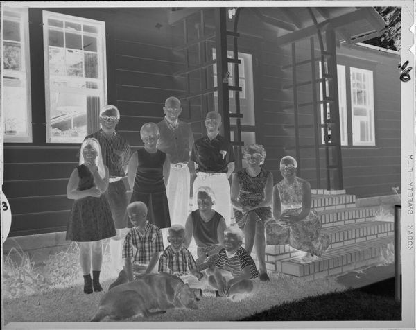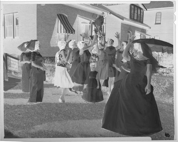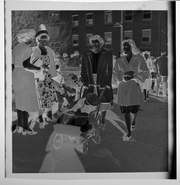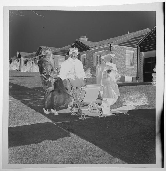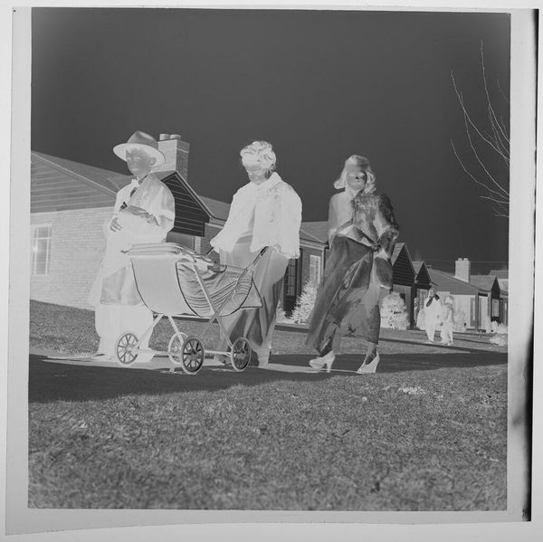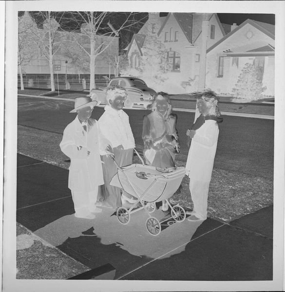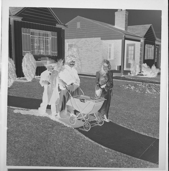 Curator: This gelatin silver print, a small work at just 5.7 x 5.7 cm, is an untitled piece by Jack Gould, currently held in the Harvard Art Museums. My first impression is eerie; the high contrast and the inverted tones give this photograph a surreal quality. Editor: Yes, the negative tonality certainly lends an unsettling feel. But consider the context: children playing dress-up. Isn’t this about the rituals of childhood mimicking adult life, a practice deeply embedded in social learning? Curator: I see your point, but there's a palpable anxiety here. The vacant expressions, the stark contrast... It speaks to a broader societal unease, perhaps reflecting anxieties around domesticity and conformity. The identical houses in the background feel almost dystopian. Editor: Or, perhaps, they represent the aspirational suburban dream of the era. Regardless, the composition, with the figures centered and marching forward, leads the eye directly through their narrative. Curator: Whether critique or celebration, Gould captures a potent image of societal expectations and the performance of normalcy. Editor: Absolutely. And it's the visual tension, the push and pull of form and meaning, that makes it so compelling.