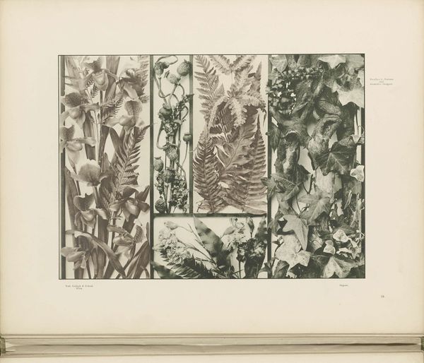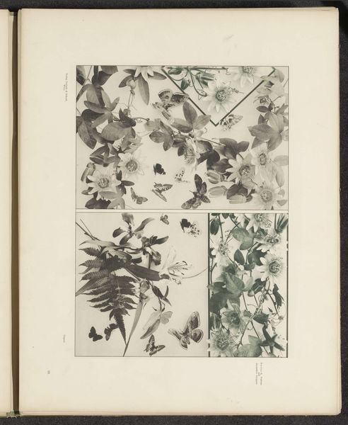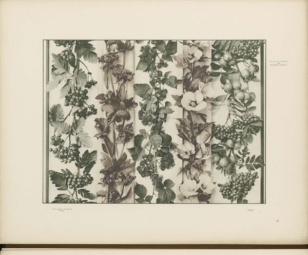 Editor: This print, "Vlakken met abrikozen, kersen en vogels", or "Panels with Apricots, Cherries, and Birds," is believed to be from before 1897. It's really captivating. The repetition of fruit and birds creates a striking pattern, almost like wallpaper. What strikes you most about the visual language here? Curator: The imagery resonates with a longstanding symbolic dialogue. Fruit, especially when paired with birds, can signify both earthly pleasures and the fleeting nature of beauty and life. Notice how these aren't simply botanical illustrations. They’re framed, segmented, almost presented as captured moments. What do you think this "framing" does to our understanding? Editor: It does feel intentional, less like observation and more like... almost curated memories? Are these fruits and birds common symbols within art of this period? Curator: Absolutely. Consider the tradition of still life, *vanitas* paintings. The presence of fruit—especially ripe or decaying fruit—often alludes to mortality. Birds, meanwhile, represent the soul's flight, the ethereal, or freedom. Bringing these elements together creates a powerful juxtaposition of the tangible and intangible, earthly and spiritual. Do the positioning of the birds, either caught in motion or static, also add to that interpretation? Editor: Definitely. The birds mid-flight emphasize that fleeting sense of time. I’m now noticing that the symmetry, coupled with the dynamic poses of the birds, seems to heighten the contrast. Curator: Precisely! The symmetry gives a sense of order, while the birds disrupt it, introducing movement and perhaps a hint of the unpredictable. This dance between order and chaos reflects, in a way, the human condition. Editor: I hadn't thought of it that way before. The way you broke down the symbolism really sheds a new light on this piece! Curator: And seeing your perspective helps me think about the power of visual cues through art across time and history.