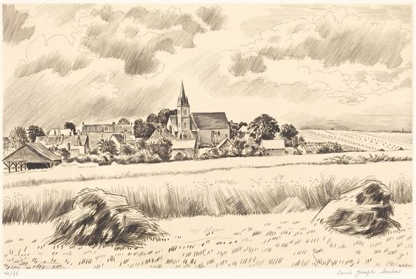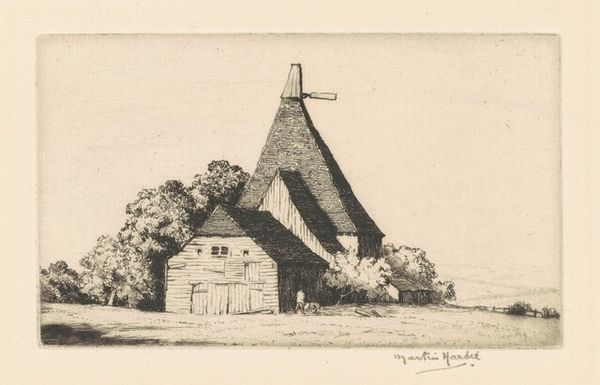 Editor: This etching by F.L. Griggs, "Netherton Chapel," created in 1935, has such a wonderfully textured and somewhat haunting atmosphere. What stories do you think this image might be telling? Curator: I see in it a powerful commentary on the state of the rural church in 1930s England. Griggs, deeply concerned with preserving traditional craftsmanship and rural ways of life, captured Netherton Chapel at a time when many such buildings were falling into disrepair or being lost altogether. The somber light and dense foliage seem to press in on the building, symbolizing the challenges faced by these communities. What does the chapel itself signify to you? Editor: Well, the chapel seems to stand as a symbol of resilience, even with the encroaching landscape you mentioned. It feels… defiant, somehow. Curator: Exactly! And note the medium: etching. Think about the labor involved in the etching process, the careful attention to detail. It echoes the craftsmanship Griggs so admired. Can we draw a parallel between the chapel's struggle for survival and the artist's own struggle to preserve these values through his art? What about how religion plays into the setting? Editor: That’s a fascinating connection! It definitely brings a new dimension to the print, viewing it as more than just a landscape but as a social statement. I hadn’t considered the active role of the artist’s viewpoint and cultural concerns while focusing on composition. Curator: Right. It becomes less about objective representation and more about Griggs's subjective experience and commentary on the changing rural landscape and cultural identities in that time. So, perhaps our reading should challenge that sense of 'defiance' into a broader, quieter resilience during societal shift. Editor: I understand! I’ll never look at a landscape etching the same way again! Thank you! Curator: And thank you. I am reminded that even seemingly quiet rural scenes have stories to tell about change.